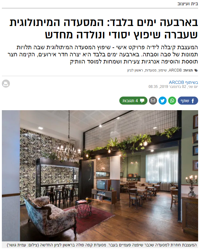 המעצבת קיבלה לידיה פרויקט אישי - שיפוץ המסעדה המיתולוגית שבה תלויות תמונות של סבה וסבתה. בארבעה ימים בלבד היא יצרה חדר אירועים, הקימה חצר תוססת והוסיפה אנרגיות צעירות ושמחות למוסד הוותיק קרא עוד >>