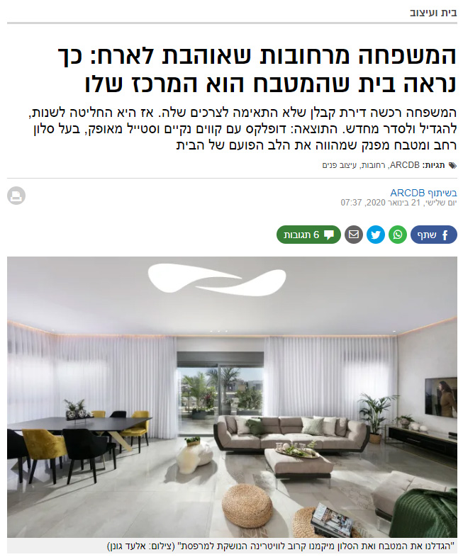 המשפחה רכשה דירת קבלן שלא התאימה לצרכים שלה. אז היא החליטה לשנות, להגדיל ולסדר מחדש. התוצאה: דופלקס עם קווים נקיים וסטייל מאופק, בעל סלון רחב ומטבח מפנק שמהווה את הלב הפועם של הבית קרא עוד >>