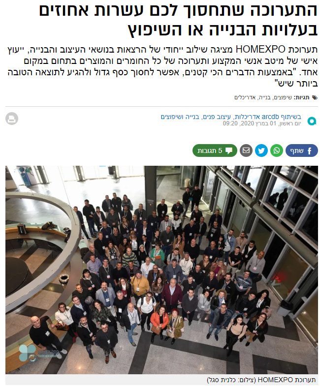 תערוכת HOMEXPO מציגה שילוב ייחודי של הרצאות בנושאי העיצוב והבנייה, ייעוץ אישי של מיטב אנשי המקצוע ותערוכה של כל החומרים והמוצרים בתחום במקום אחד. "באמצעות הדברים הכי קטנים, אפשר לחסוך כסף גדול ולהגיע לתוצאה הטובה ביותר שיש" קרא עוד >>