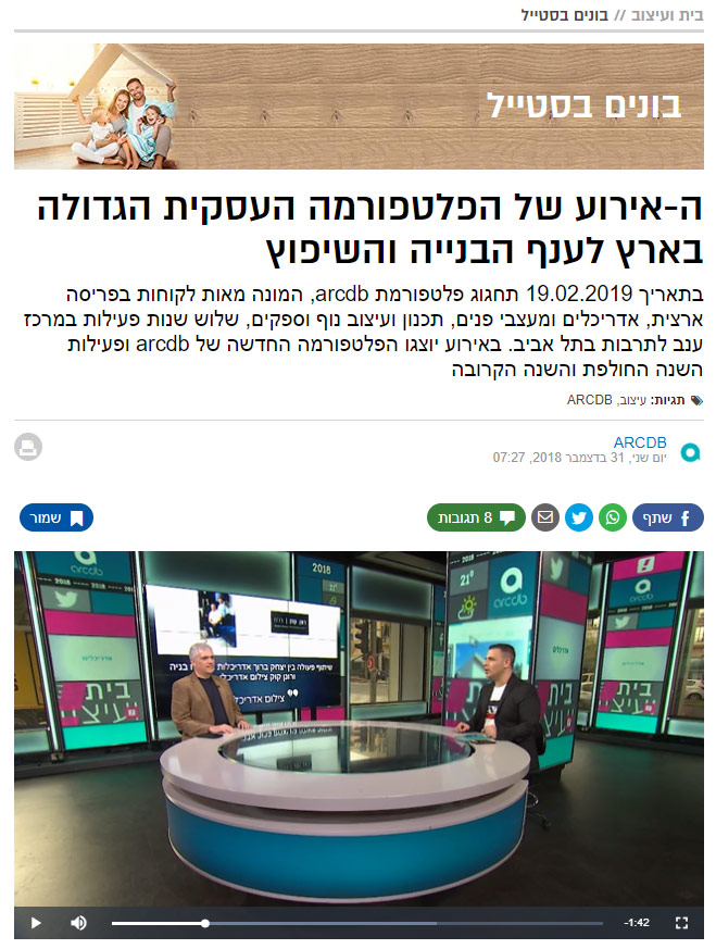 בתאריך 19.02.2019 תחגוג פלטפורמת arcdb, המונה מאות לקוחות בפריסה ארצית, אדריכלים ומעצבי פנים, תכנון ועיצוב נוף וספקים, שלוש שנות פעילות במרכז ענב לתרבות בתל אביב. באירוע יוצגו הפלטפורמה החדשה של arcdb ופעילות השנה החולפת והשנה הקרובה קרא עוד >>
