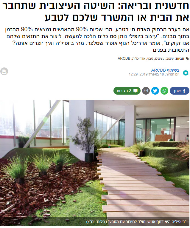 אם בעבר הרחוק האדם חי בטבע, הרי שכיום 90% מהאנשים נמצאים 90% מהזמן בתוך מבנים. "עיצוב ביופילי נותן סט כלים הלכה למעשה, ליצור את התנאים שלהם אנו זקוקים", אומר אדריכל הנוף אופיר שטלצר. מהי ביופיליה ואיך יוצרים אותה? התשובות בפנים קרא עוד >>