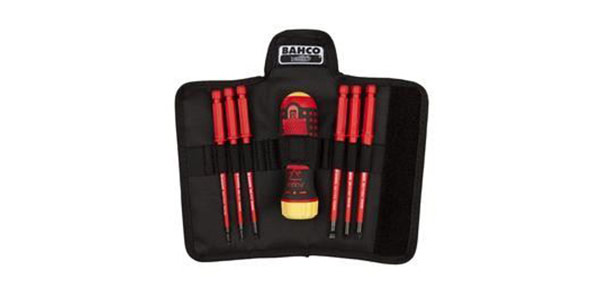 סט מברג שכולל ידית רצ'ט עם  בידוד 1000V  לחשמל חי הכולל סט להבי מברגים שונים הניתנים להחלפה בנרתיק איכותי תוצרת BAHCO הידית בעלת בידוד  דו קומפוננט עם חומר רך, בעל חיכוך גבוה, עם פני שטח מחוספס לאחיזה נוחה •למברג רצ'ט 48 שיניים המאפשר פעולה חלקה וקשת סיבוב מינימלית כדי להינעל על השן הבאה. תוצרת  BAHCO
