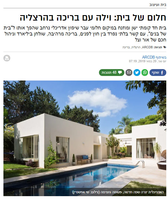 בית חד קומתי ישן ומוזנח במיקום חלומי עבר שיפוץ אדריכלי נרחב שהפך אותו ל"בית של בנים", עם קשר בלתי נפרד בין חוץ לפנים, בריכה מרהיבה, שולחן ביליארד וניהול חכם של אור וצל קרא עוד >>