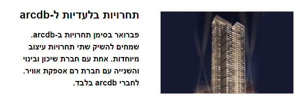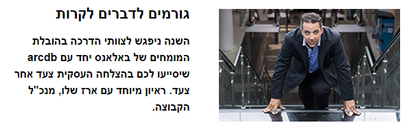 אני שמח להציג בפניכם את הניוזלטר הראשון שלנו arcdb news בו נוכל לשמור על קשרר ולחזק את הקהילה הענפה שצומחת כאן. אנו שוקדים כל עת על פיתוח הפלטפורמהה הטכנולוגית העסקית הייחודית מסוגה, כולל מגוון כלים אפקטיביים וחשיפת הזדמנויות עסקיות. תודה לכל מי ששותף לדרך ואני מקווה שאתם נהנים מהמערכת והיכולות שהיא מעניקה לכם להתמקצע ביחד ולחוד.