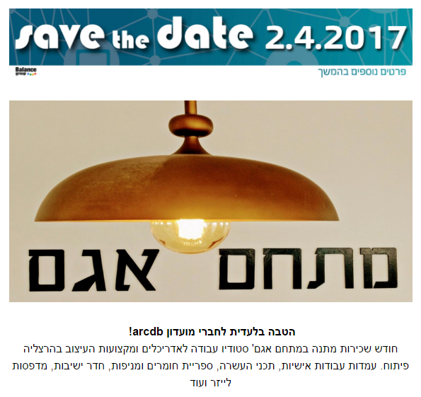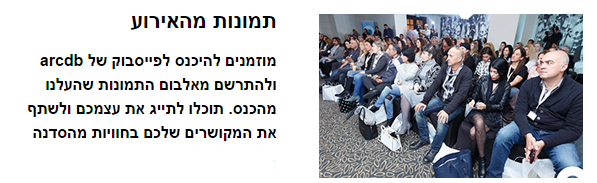 שמח ונרגש לפתוח את הניוזלטר arcdb news ועמו ערוץ ישיר לכל אחת ואחד מכם, הקהילה שלנו רוקמת עור וגידים. ב- 14.2 נפגשנו לסדנה עסקית ומקצועית ראשונה במלון הרודס תל אביב וחשפנו בפניכם שתי תחרויות ייחודיות מסוגן.