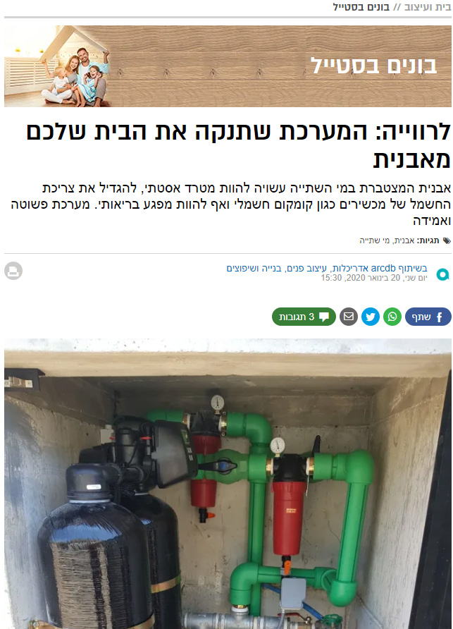 אבנית המצטברת במי השתייה עשויה להוות מטרד אסטתי, להגדיל את צריכת החשמל של מכשירים כגון קומקום חשמלי ואף להוות מפגע בריאותי. מערכת פשוטה ואמידה קרא עוד >>