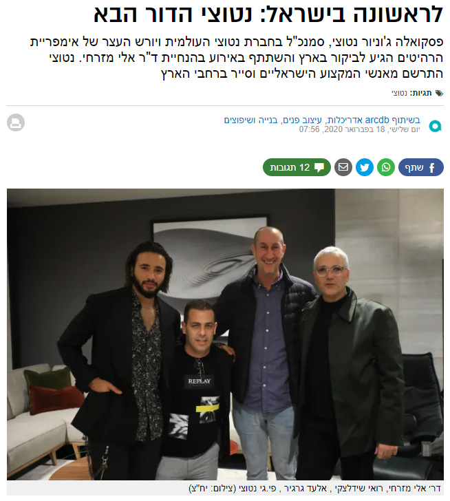 פסקואלה ג'וניור נטוצי, סמנכ"ל בחברת נטוצי העולמית ויורש העצר של אימפריית הרהיטים הגיע לביקור בארץ והשתתף באירוע בהנחיית ד"ר אלי מזרחי. נטוצי התרשם מאנשי המקצוע הישראליים וסייר ברחבי הארץ קרא עוד >>