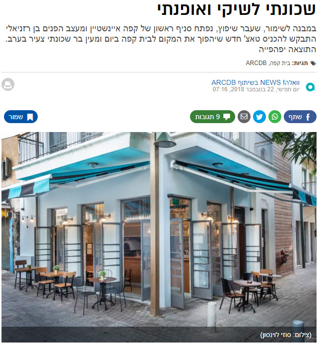 במבנה לשימור, שעבר שיפוץ, נפתח סניף ראשון של קפה איינשטיין ומעצב הפנים בן רזניאלי התבקש להכניס טאצ' חדש שיהפוך את המקום לבית קפה ביום ומעין בר שכונתי צעיר בערב. התוצאה יפהפייה קרא עוד >>
