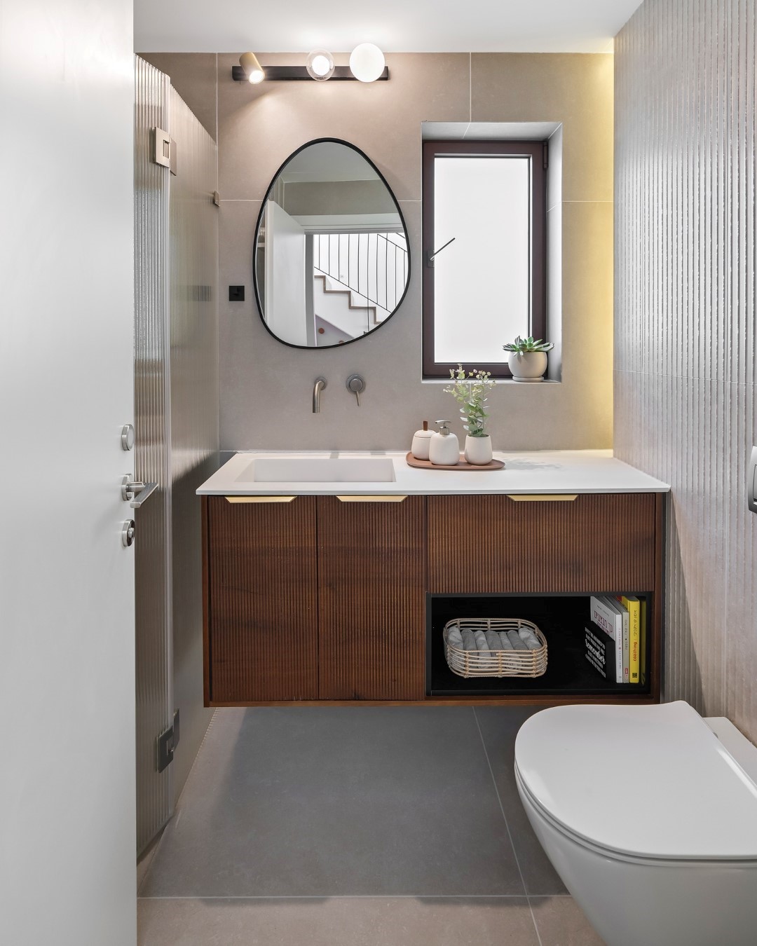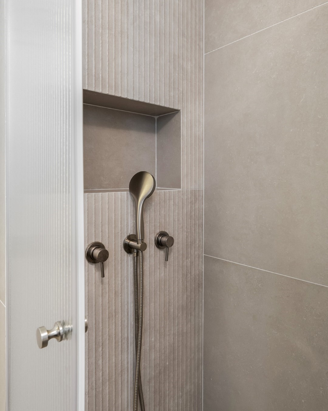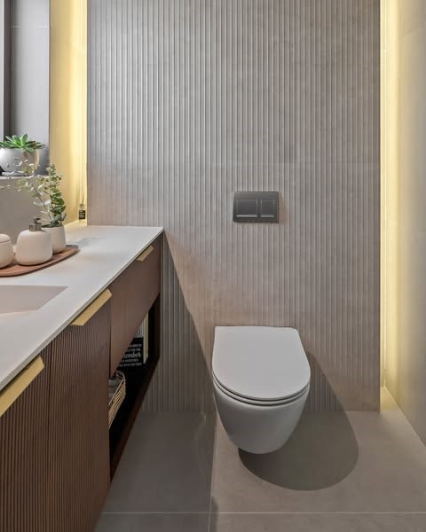 כאן יצרתי קיר כוח עם תאורה נסתרת שמדגישה את הייחודיות של האריחים. הטקסטורות והפסים חוזרים גם בנגרות וגם בזכוכית, מה שיוצר חלל עם קו עיצובי ברור. התוצאה היא מקום שמשרה רוגע וסטייל בו זמנית.לי מתחשק להתקלח – מה איתכם? 🛁✨