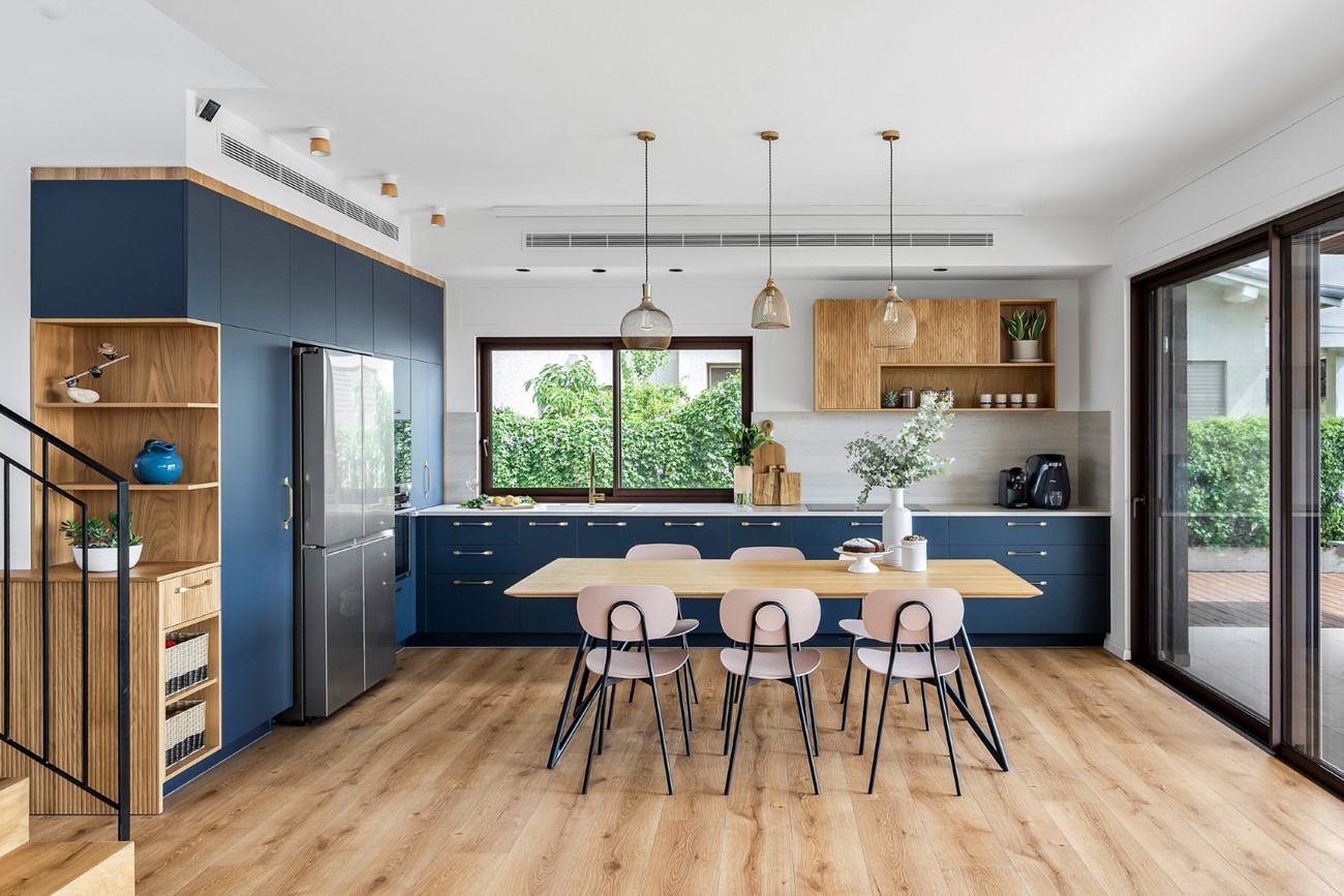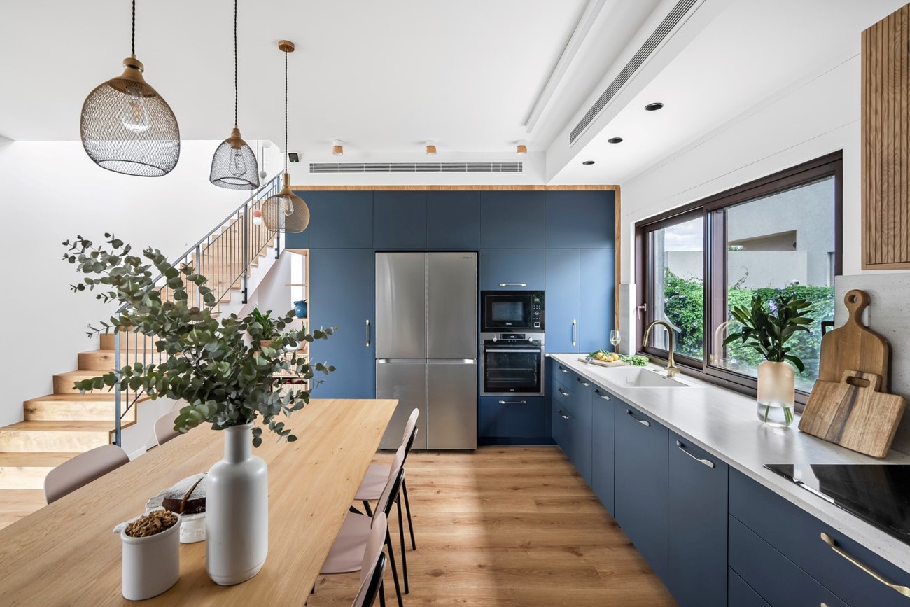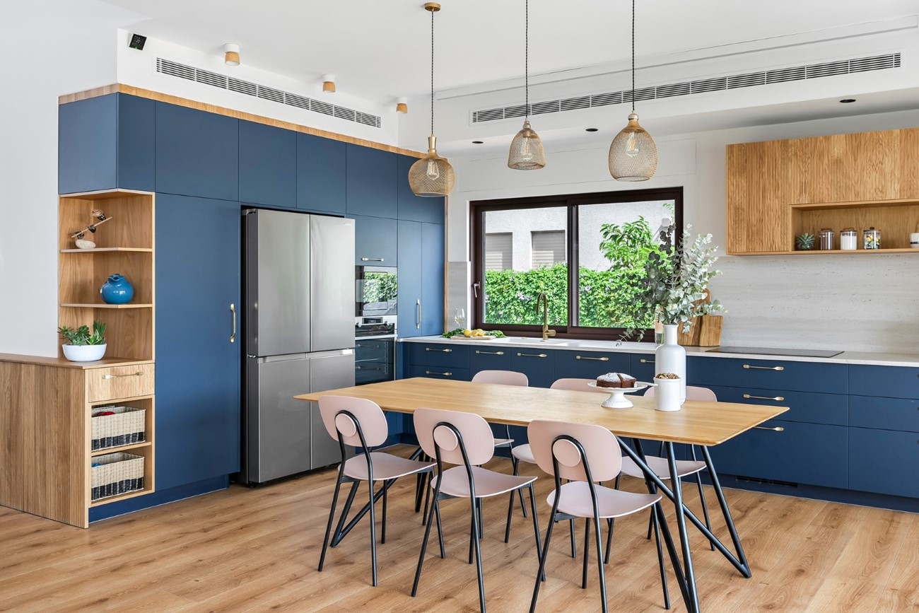 עם חזיתות בציפוי אקרילי כחול עמוק ועץ פורניר אלון, השילוב הזה לא רק מספק חום, אלא גם אופי וייחודיות שאין להם תחליף.