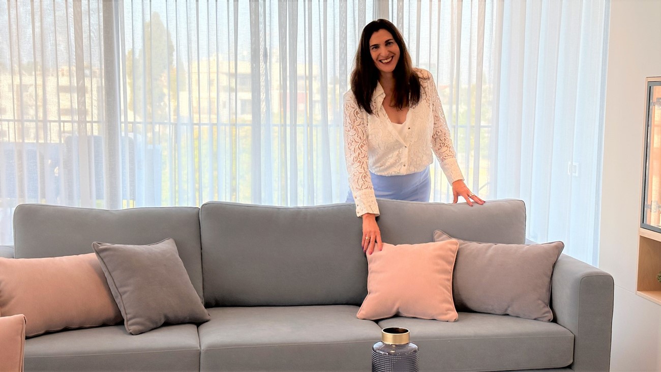 ענת וייסברג עם ספה מחזיקה כרית