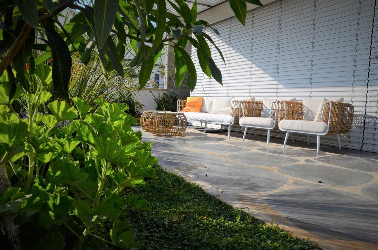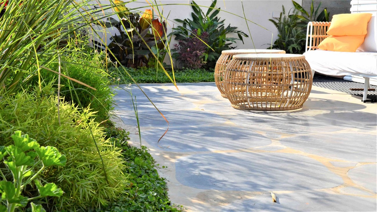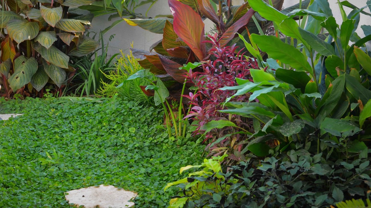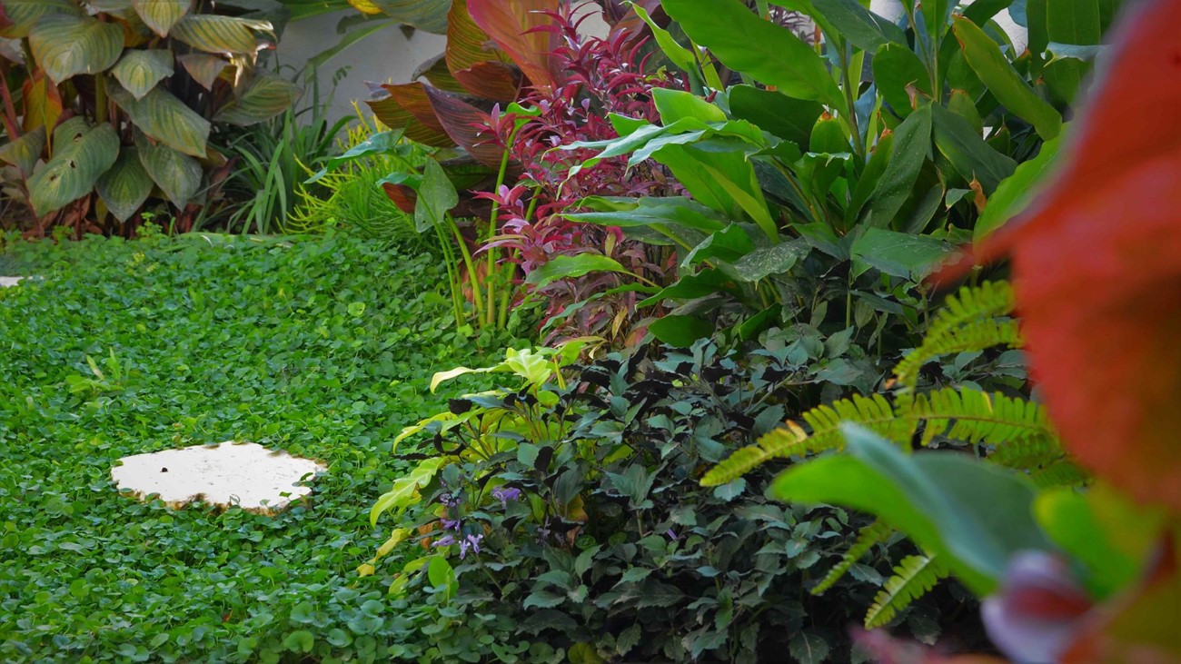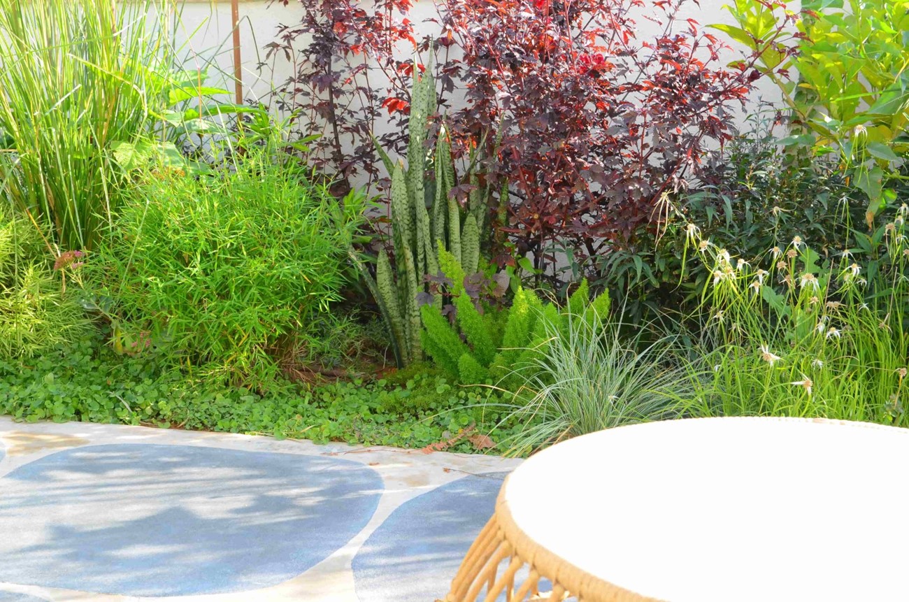 גינה בסגנון טרופי בעיצוב מדויק ומדוקדק שבו כל צמח נבחר בקפידה ונלקח בחשבון.