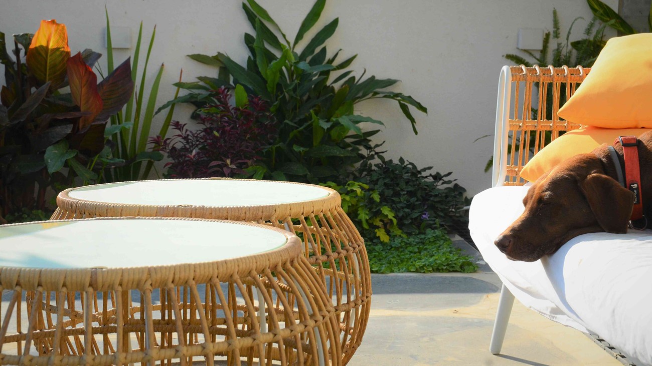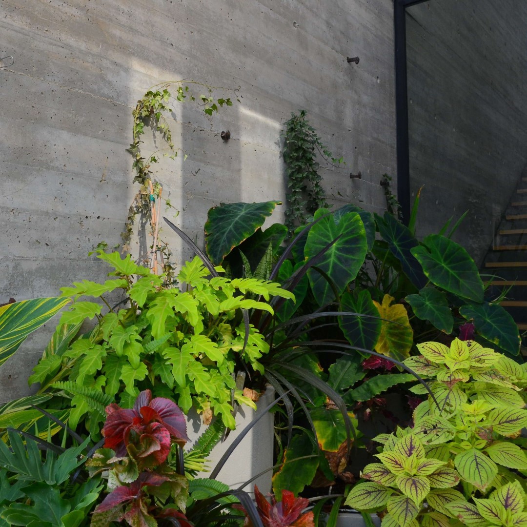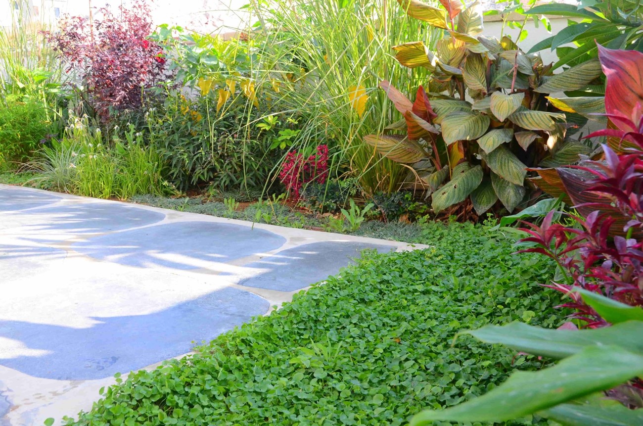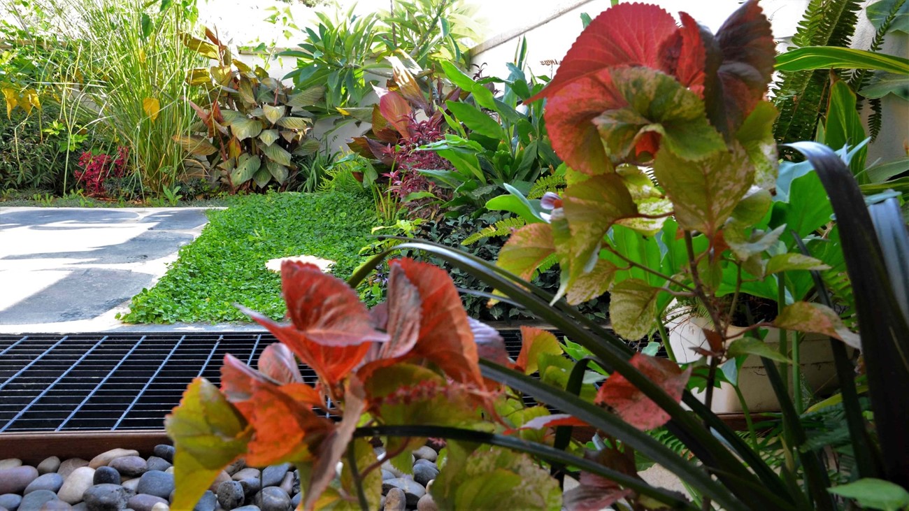 גינה בסגנון טרופי בעיצוב מדויק ומדוקדק שבו כל צמח נבחר בקפידה ונלקח בחשבון.