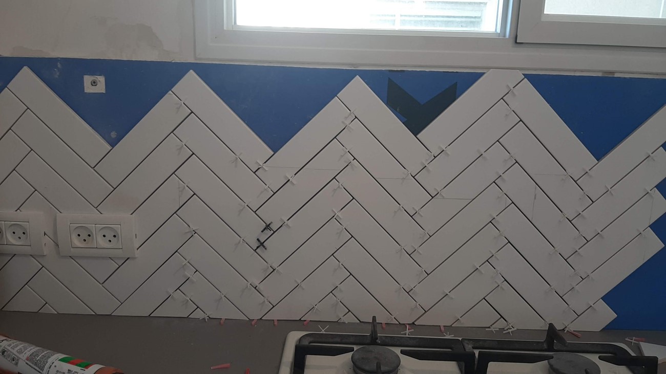חיפוי קיר מטבח בחיפוי גבס עמיד מים ועליו אריחי קרימקה בדוגמת פישבון עבודת נמלים אבל סיפוק גדול מהתוצאה