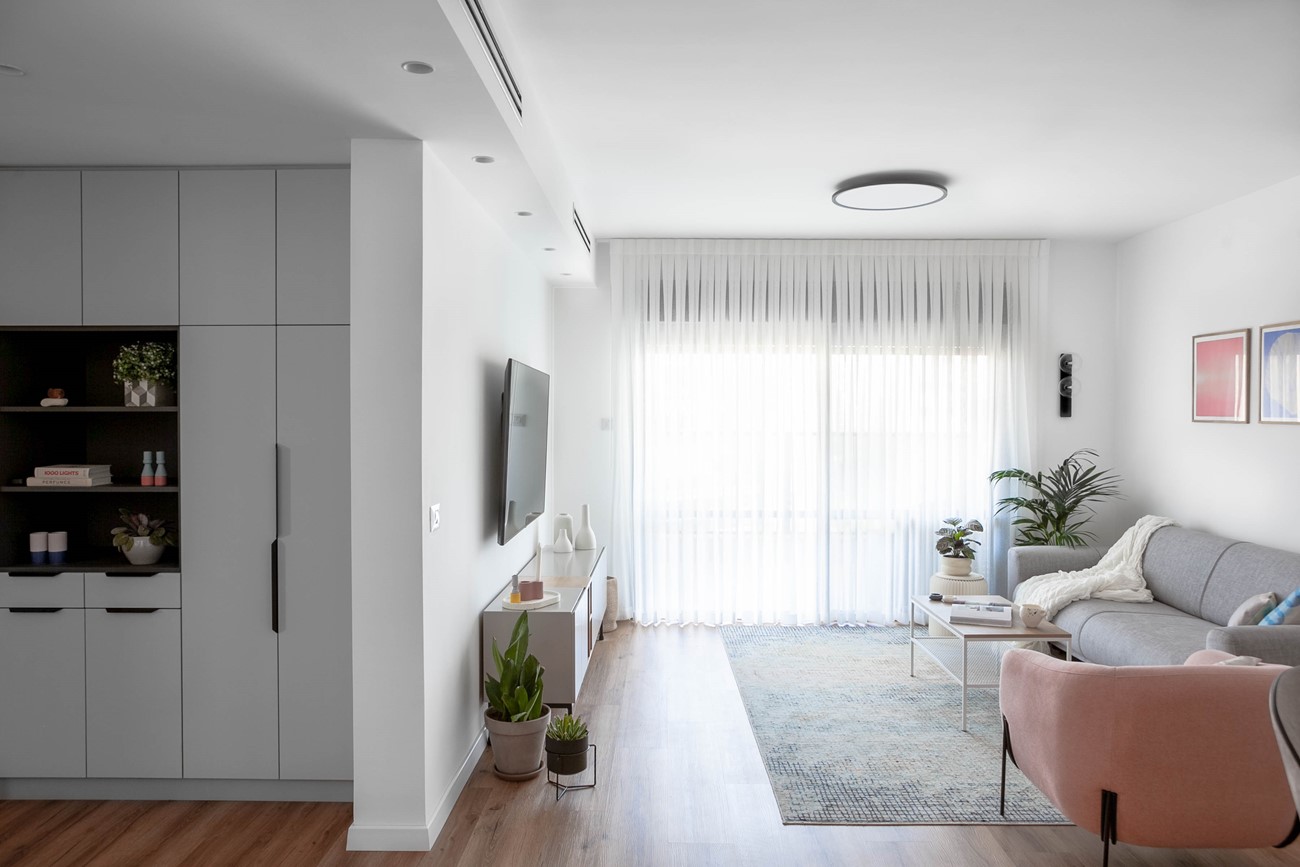 השיפוץ כלל את כל הדירה, אך התרכז בעיקר בחלל המרכזי והמטבח. הדרישה היתה ליצור חלל בסגנון נורדי, בקווים נקיים ובגוונים רגועים. נבחרה פלטת צבעים עדינה מאוד עם נגיעות של צבע נקודתיות בריהוט ובטקסטיל. עיצוב מסוג זה הוא אמירה אמביוולנטית, לא חד משמעית, שמתאימה את עצמה לכל תחושה וכל מצב רוח, לא מחייבת ואל-זמנית. קנבס מונוכרומטי, שעליו ניתן היה להוסיף כל דגש, כל תחושה, כל צבע. פלטת גוונים ששמה דגש על האנשים שחיים בבית ומעמידה אותם במרכז היצירה.