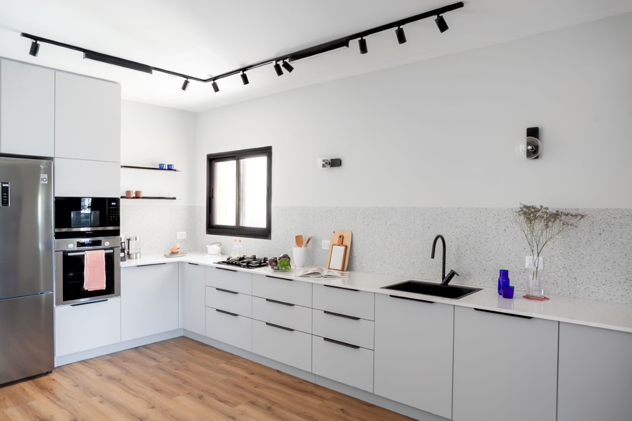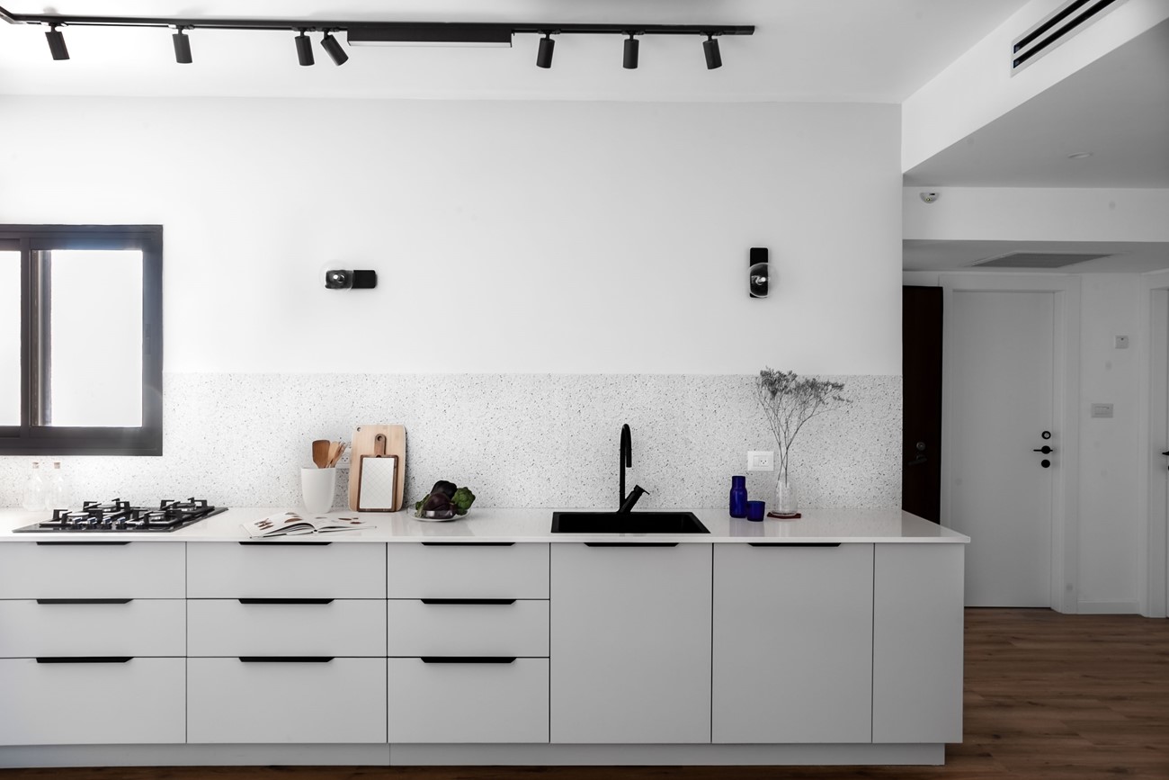 זהו פרויקט שהתנהל למחצה בזום, כי אחד מבני הזוג שהה בחו"ל בתקופת התכנון. גם לימי בחירות החומרים הלכנו עם הטלפון ביד תוך כדי שיחת וידאו – כך נבחרו החיפויים, הכלים הסניטריים והתאורה.