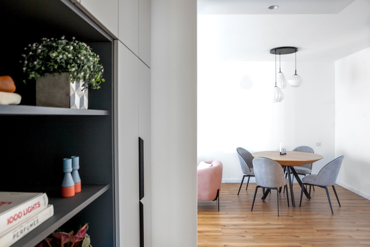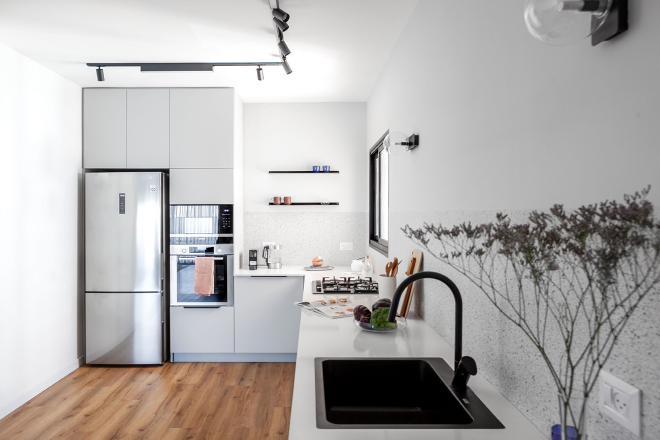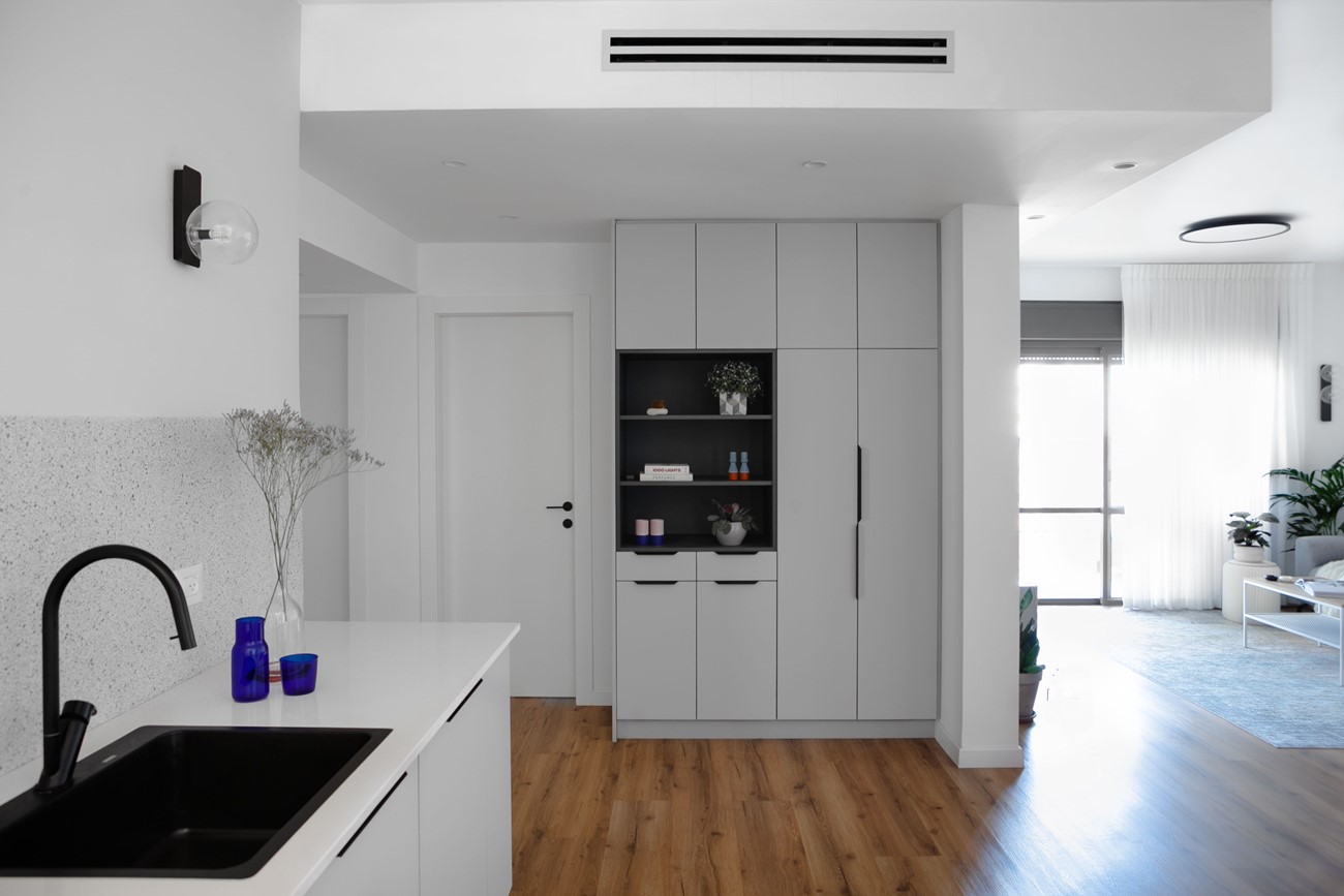 הלקוחות ביקשו מטבח לקוני ללא אי ישיבה ורצפת פרקט בכל חללי הדירה (עמיד למים). פינת האוכל פינתה את מקומה לארון מעילים המשלב ספריה, והקיר המפריד בין פינת האוכל המקורית לבין הסלון צומצם, על מנת לאפשר חלל מרווח ומואר יותר. הטעם המשובח של הלקוחות הנחה אותנו בבחירת הריהוט והתאורה. הקיר במטבח חופה באריח טרצו שהושקע בתוך הקיר על מנת ליצור מראה חלק, ללא מדרגה או בליטה כלל.