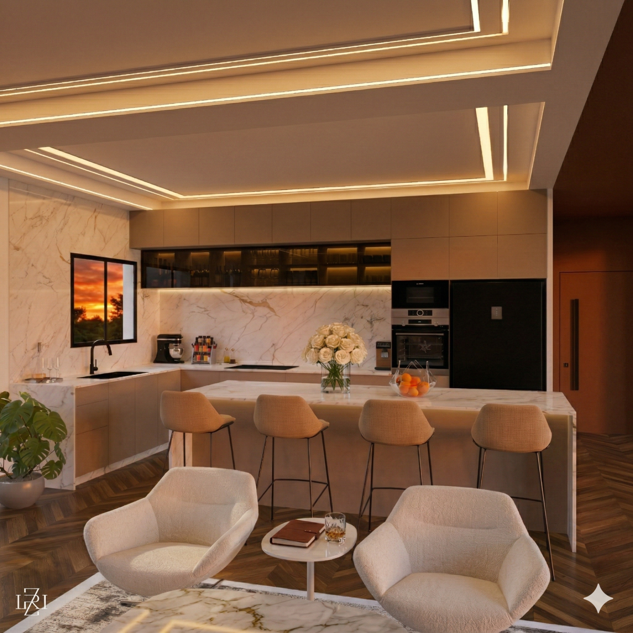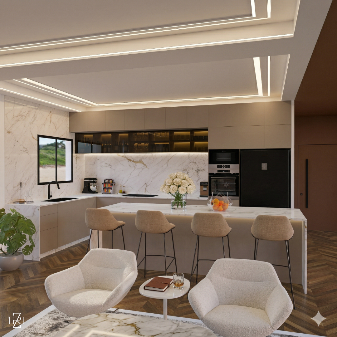 הדגש בפרויקט היה על תכנון מדויק שמחבר בין פונקציונליות לאסתטיקה — שילובי חומרים חמים לצד גוונים כהים, ותאורה שתומכת בחלל ביום ובערב.