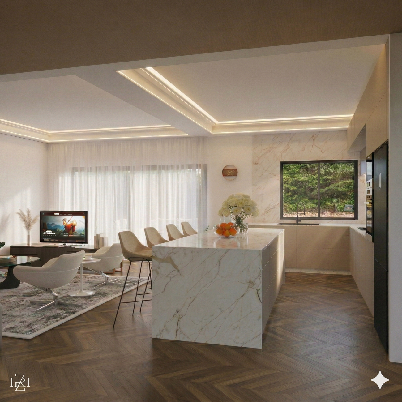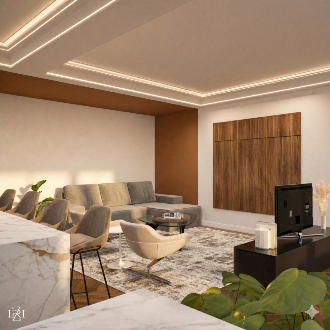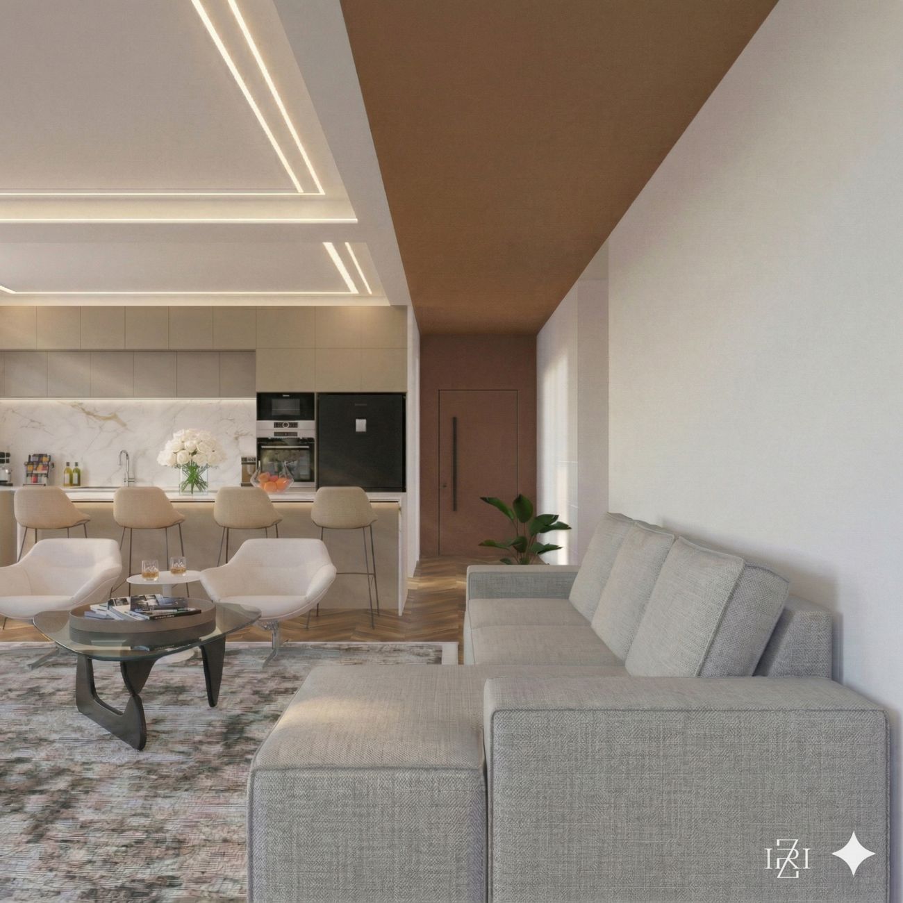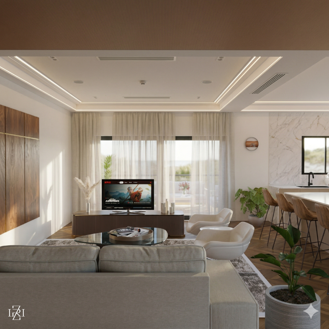 חלל מגורים שתוכנן בקו מודרני נקי עם נוכחות יוקרתית מאוזנת.