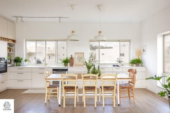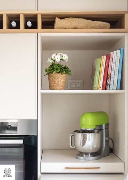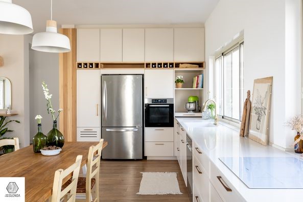במטבח זה שילבנו ארון שירות, כוורת מוארכת, מגירות ירקות מאווררות ומגירה בפינה מעל השיש לשליפה נוחה של המיקסר והטוסטר.