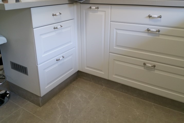 כדי להגיע עם צינור האסלה החדשה שבמקלחת לצינור של האסלה המקורית, היה צורך להעביר קו ביוב שחצה מסדרון . לשם כך יצרנו הגבהה של מדרגה של 5 סמ במסדרון. (ניתן לראות בתמונת המסדרון את ההגבהה).