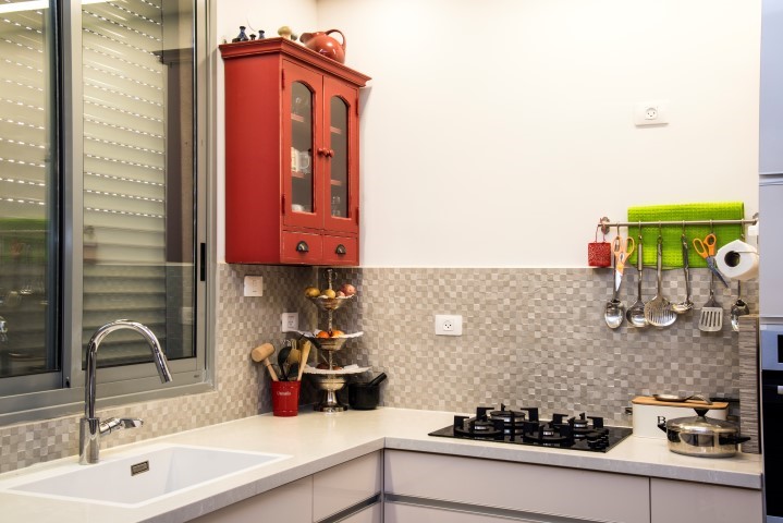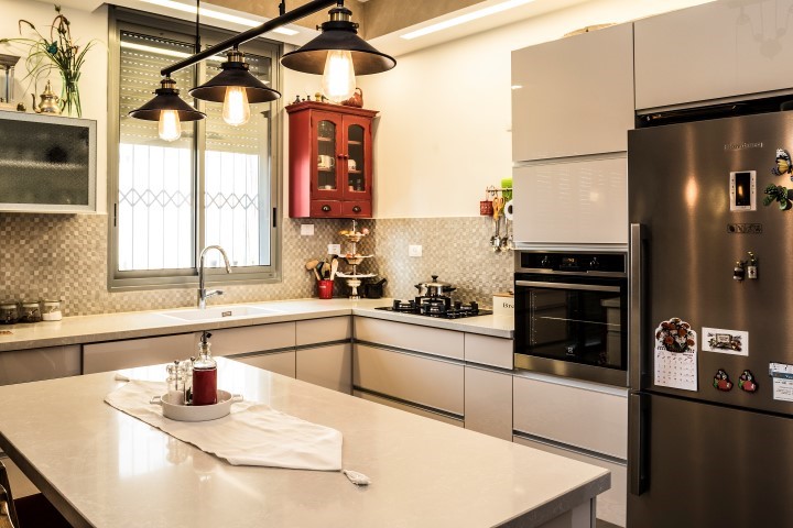 וכן במטבח - הוספה של הארון בצבע האדום - הכנה של תאורה מעל האי והכנה של מסתור לוילון שכלל גם הוספה של תאורה