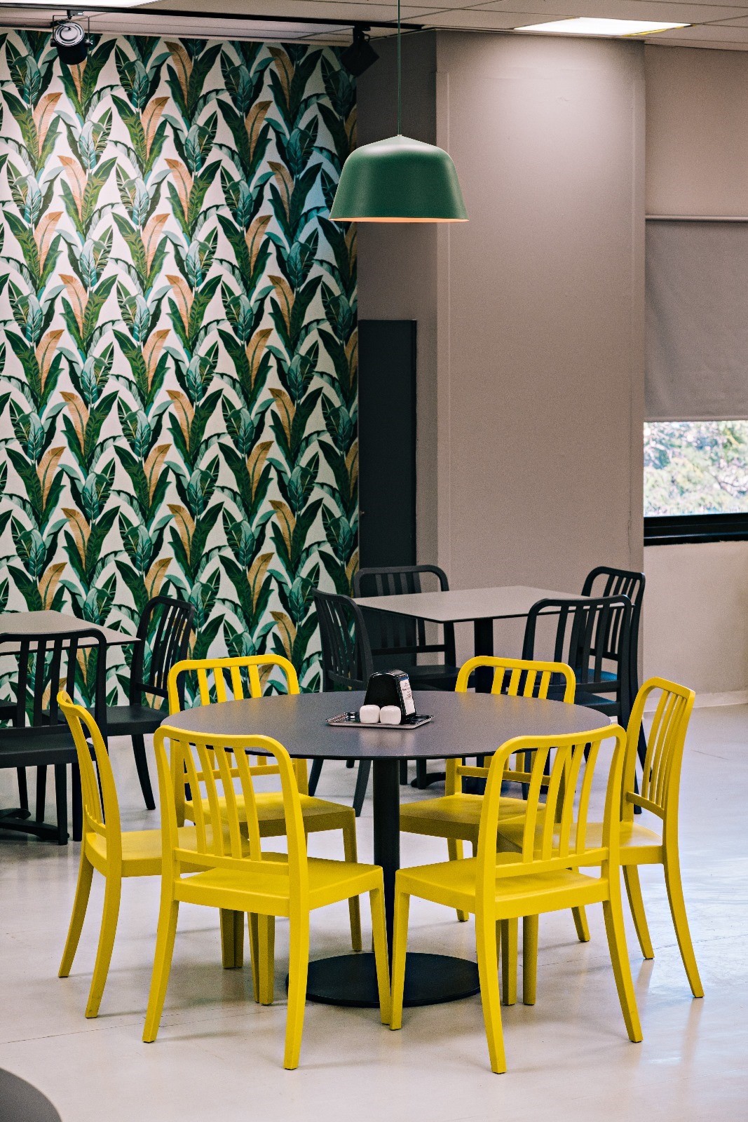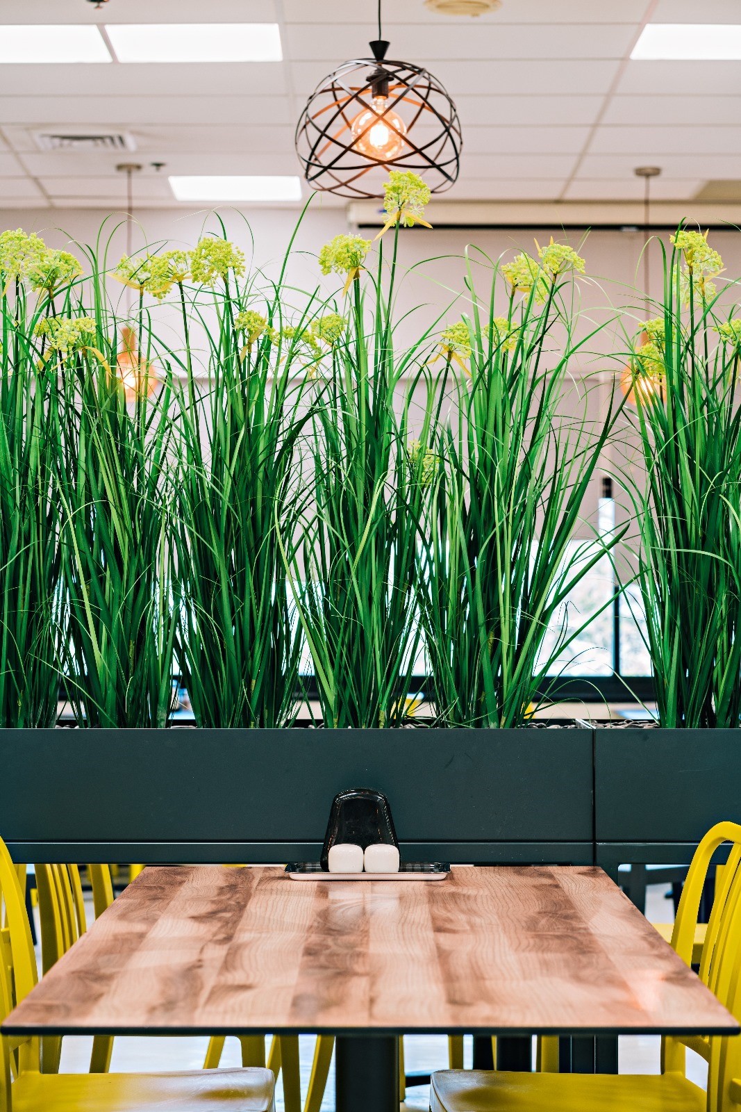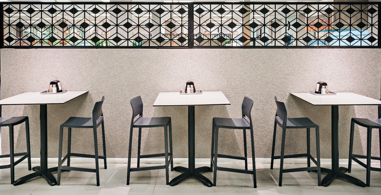 חלוקת החלל נעשתה באמצעות סוגי ישיבה מגוונים וחלוקה לפי אזורים: ישיבה גבוהה, נמוכה, ישיבה בקבוצה וישיבה עצמית. עיצבתי מחיצות מאדניות ברזל שיוצרו במיוחד עבור הפרויקט ונשתלה בהם צמחיייה מלאכותית גבוהה דבר שיצר מחיצות ואינטימיות באולם הגדול.