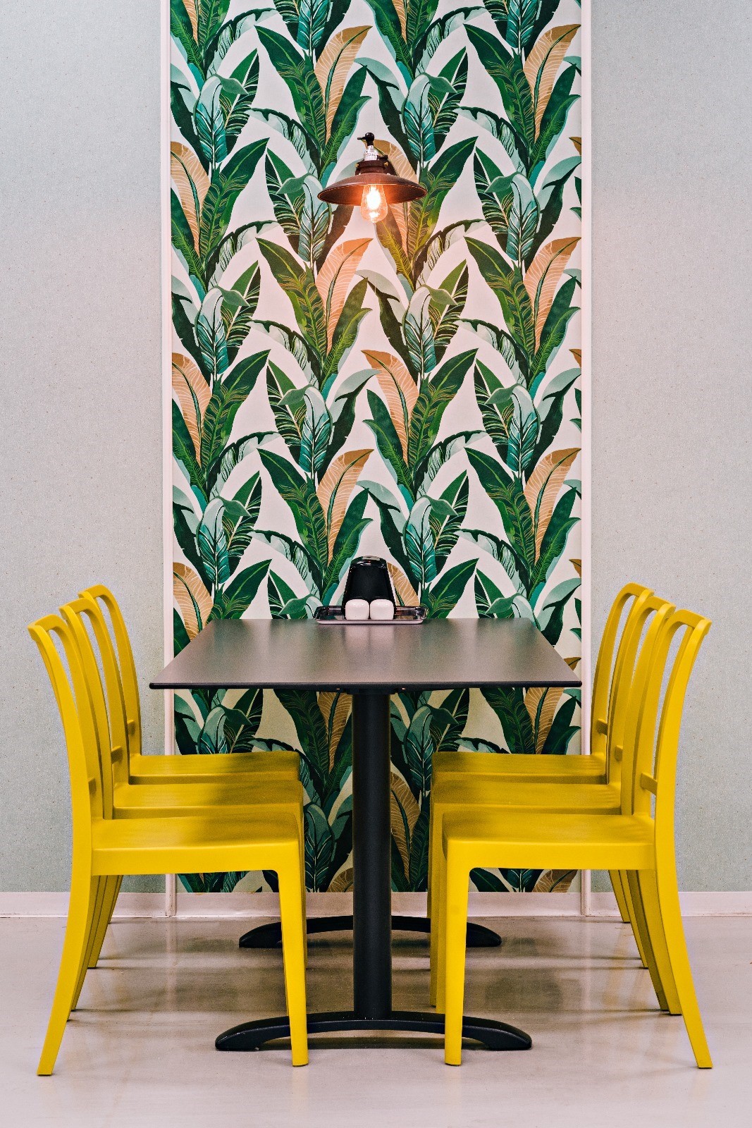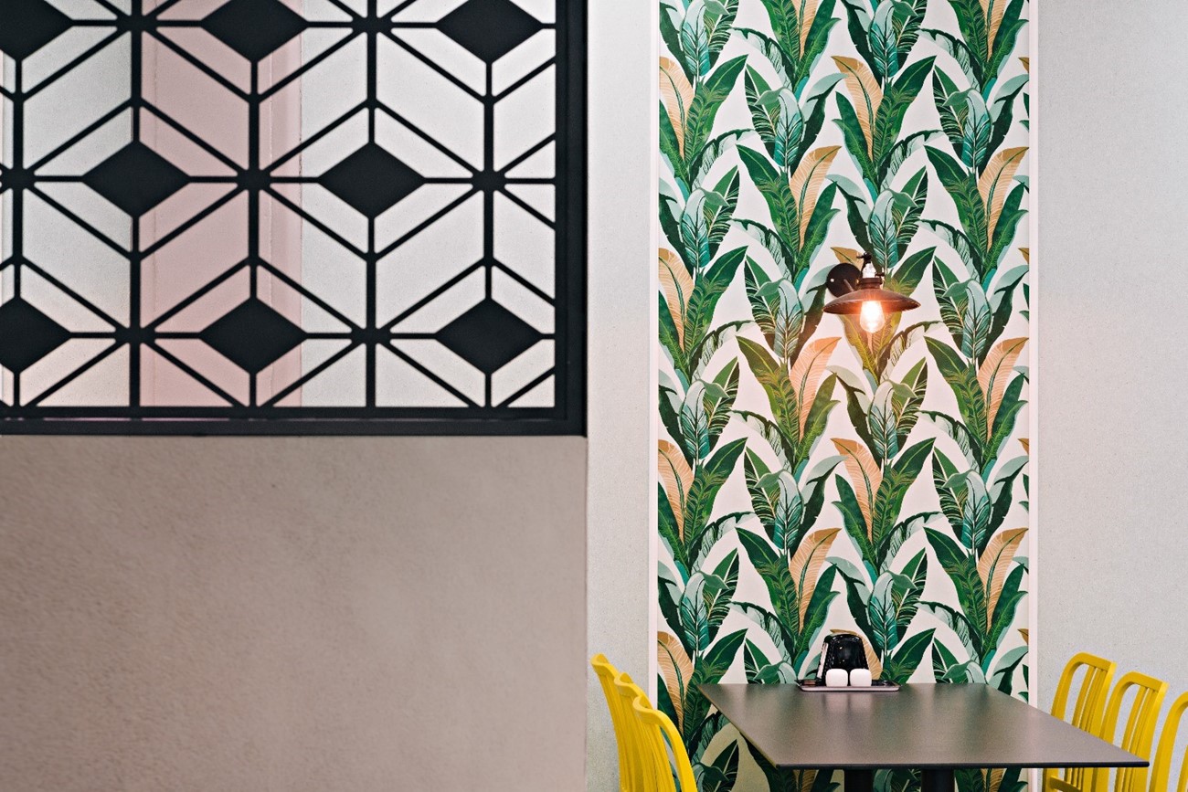 הטיפול בקירות נעשה בצבע והדבקת טפטים והוכנסו גופי תאורה מעוצבים שסיפקו תאורת אווירה חמימה ונעימה כחלופה לתאורה הלבנה והקרה הקיימת ושלא היה ניתן לשנותה.