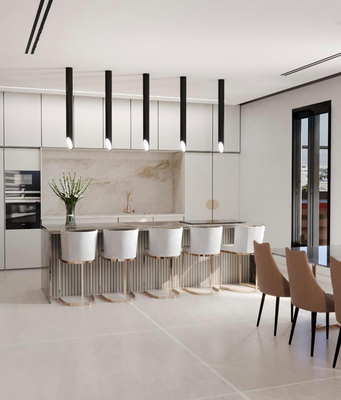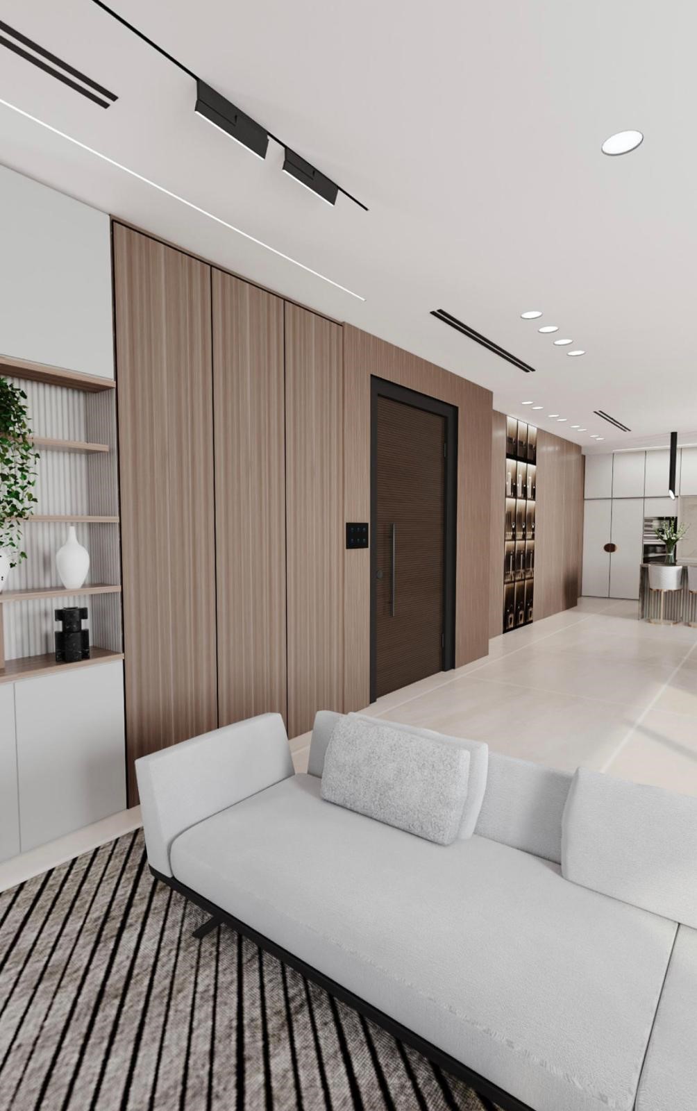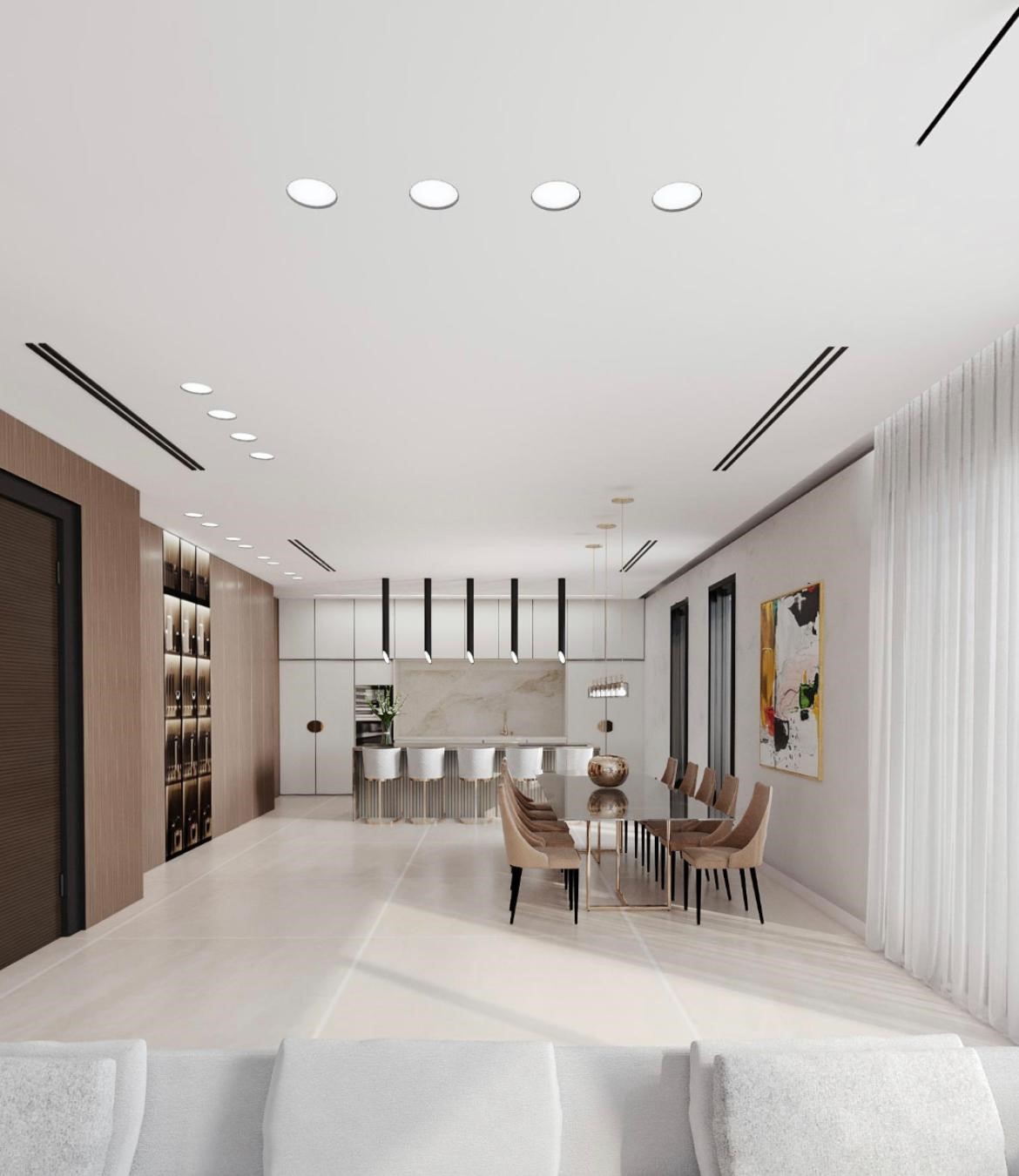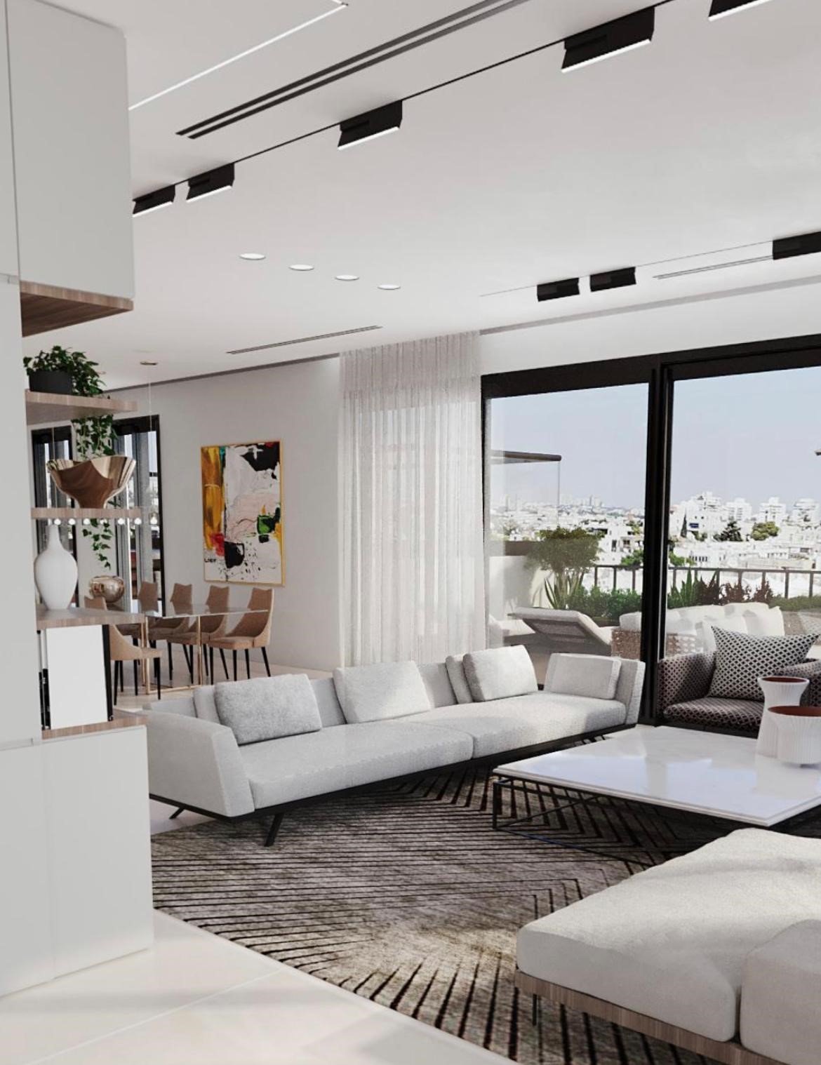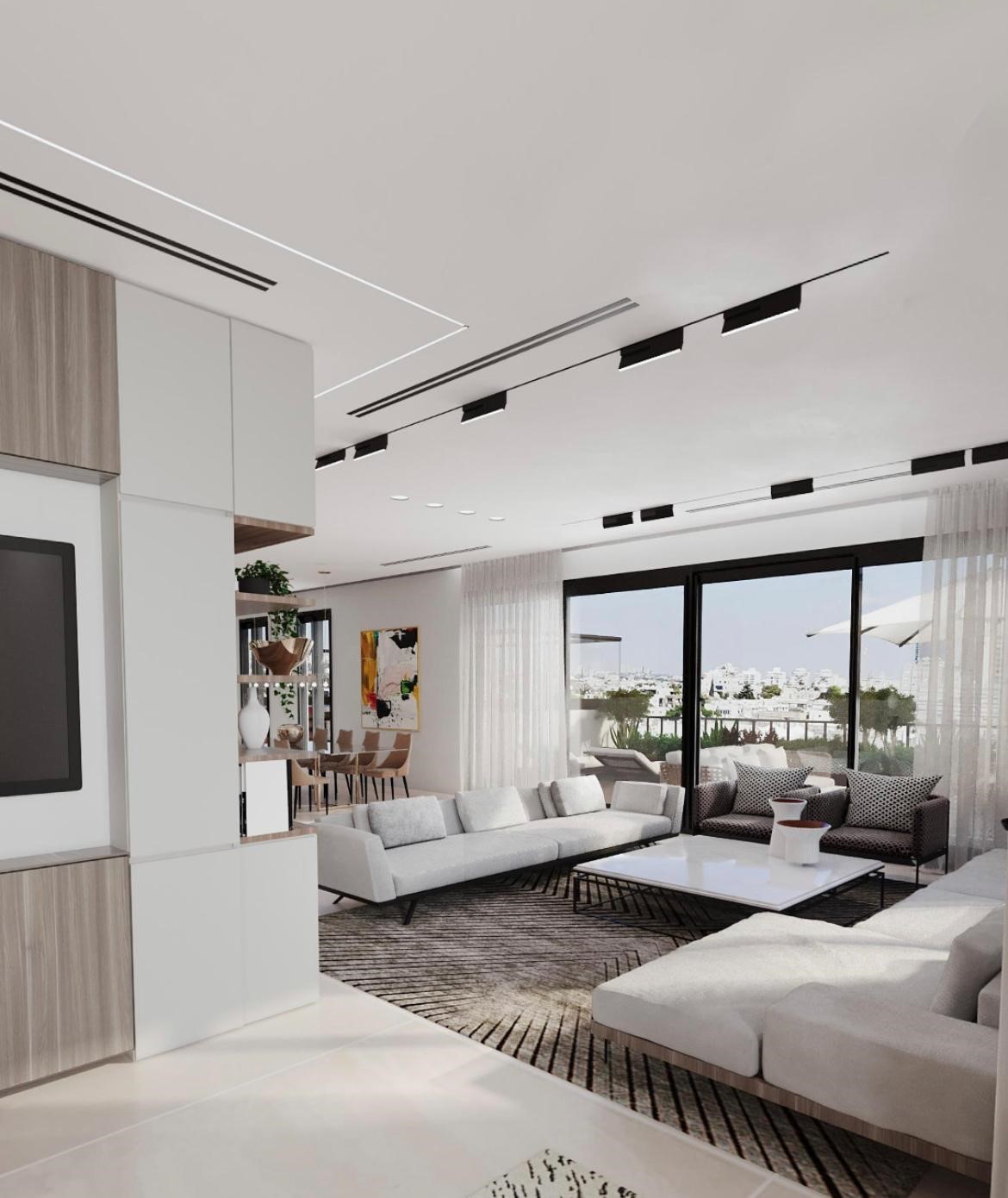 תכננתי בדירה שלושה חדרי רחצה, שרותי אורחים וארבעה חדרי שינה, פינת המשפחה סמוכה לסלון ובה קיר טלויזיה ועמדת מחשב. הקיר המרכזי הארוך בחלל הציבורי כולו נעטף ארונות בנגרות אומן המכילים שפע של איחסון. המטבח מרווח ובמרכזו אי גדול המכיל גם הוא איחסון ומשטח עבודה גדול ונוח עם ישיבה גבוהה כשלצידו פינת אוכל מרווחת המתאימה לאירוח רב משתתפים.