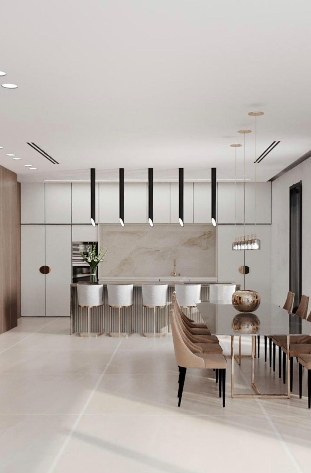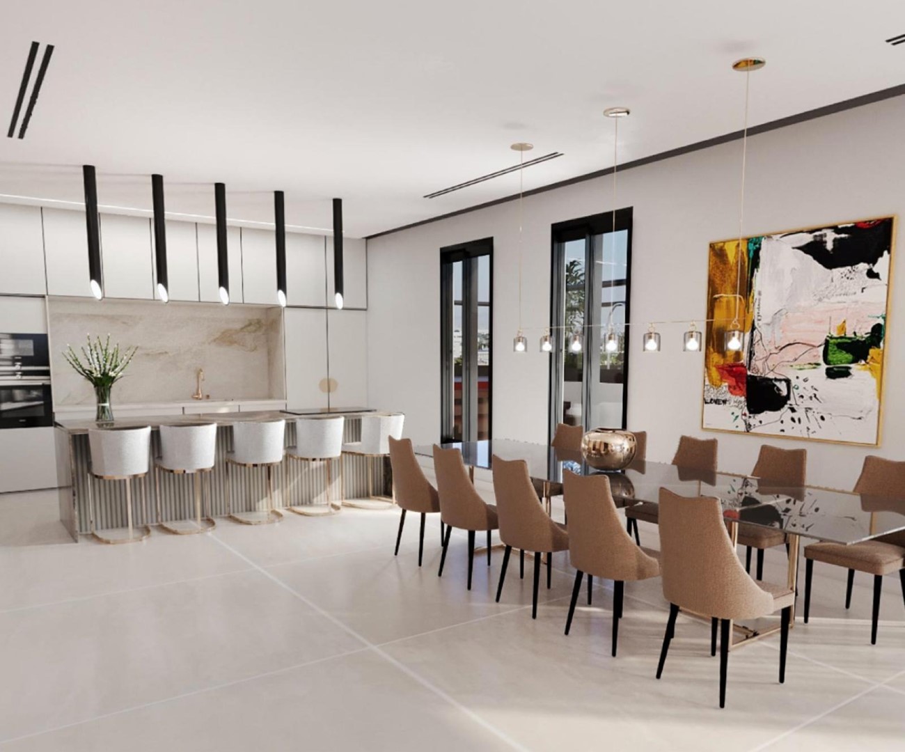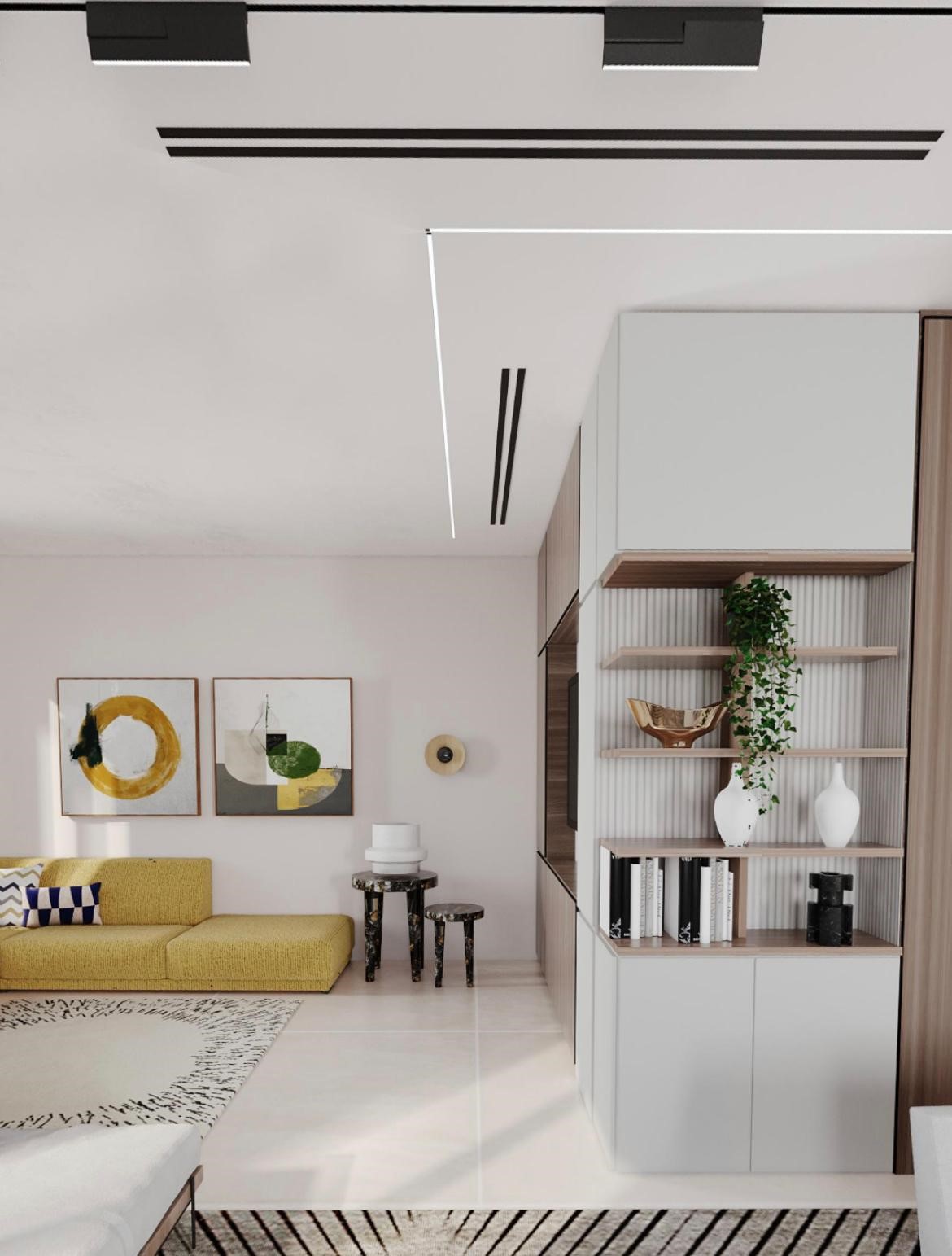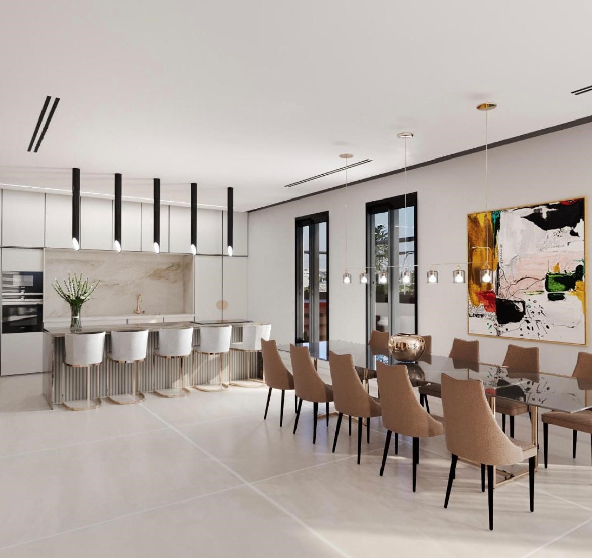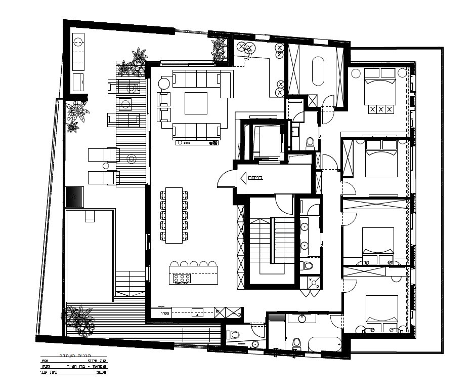 תכננתי בדירה שלושה חדרי רחצה, שרותי אורחים וארבעה חדרי שינה, פינת המשפחה סמוכה לסלון ובה קיר טלויזיה ועמדת מחשב. הקיר המרכזי הארוך בחלל הציבורי כולו נעטף ארונות בנגרות אומן המכילים שפע של איחסון. המטבח מרווח ובמרכזו אי גדול המכיל גם הוא איחסון ומשטח עבודה גדול ונוח עם ישיבה גבוהה כשלצידו פינת אוכל מרווחת המתאימה לאירוח רב משתתפים.