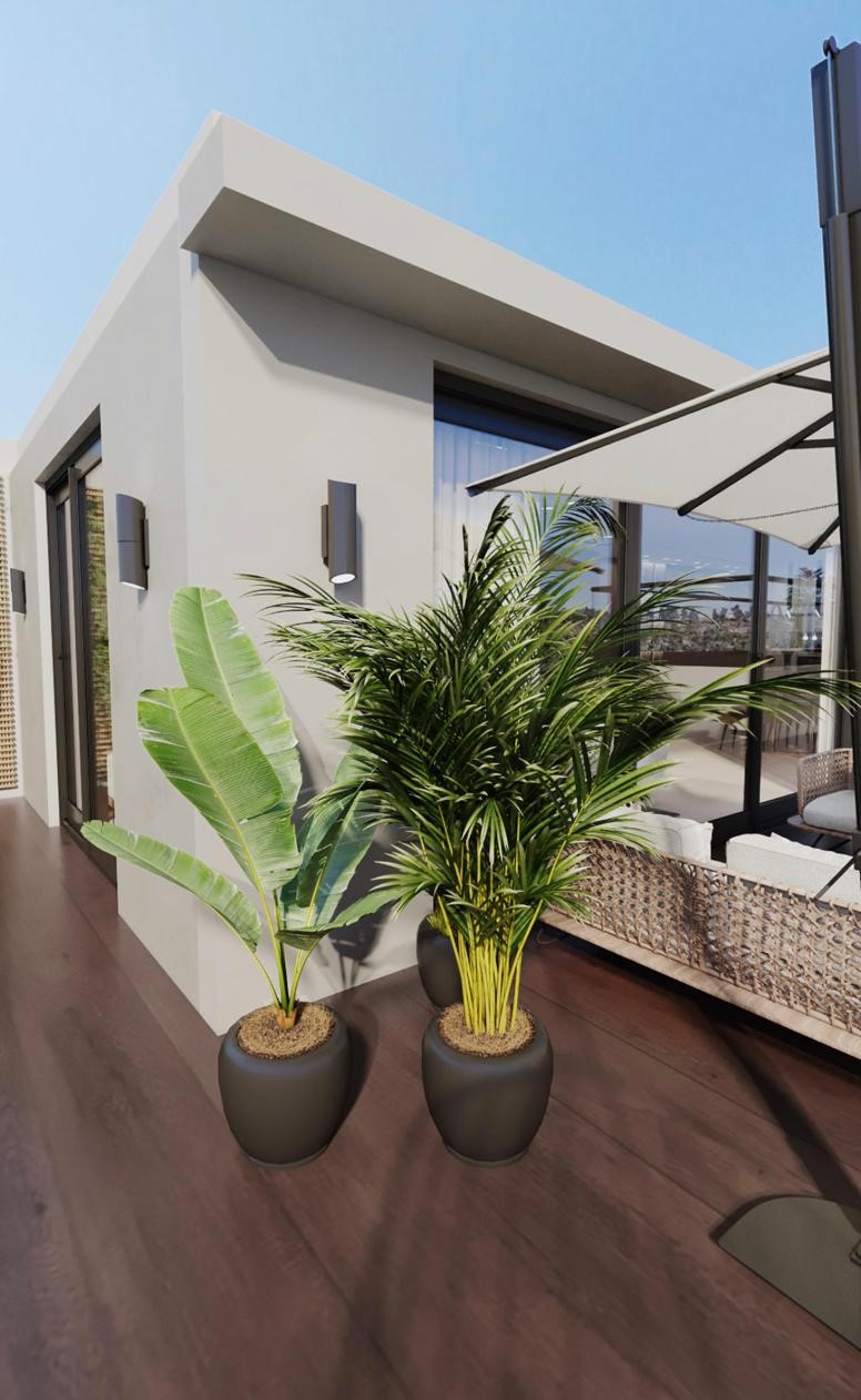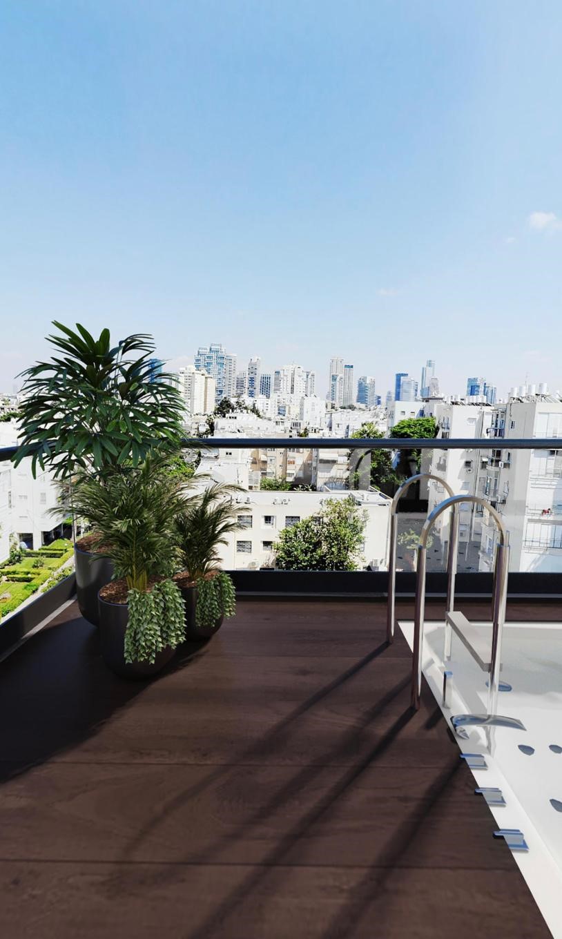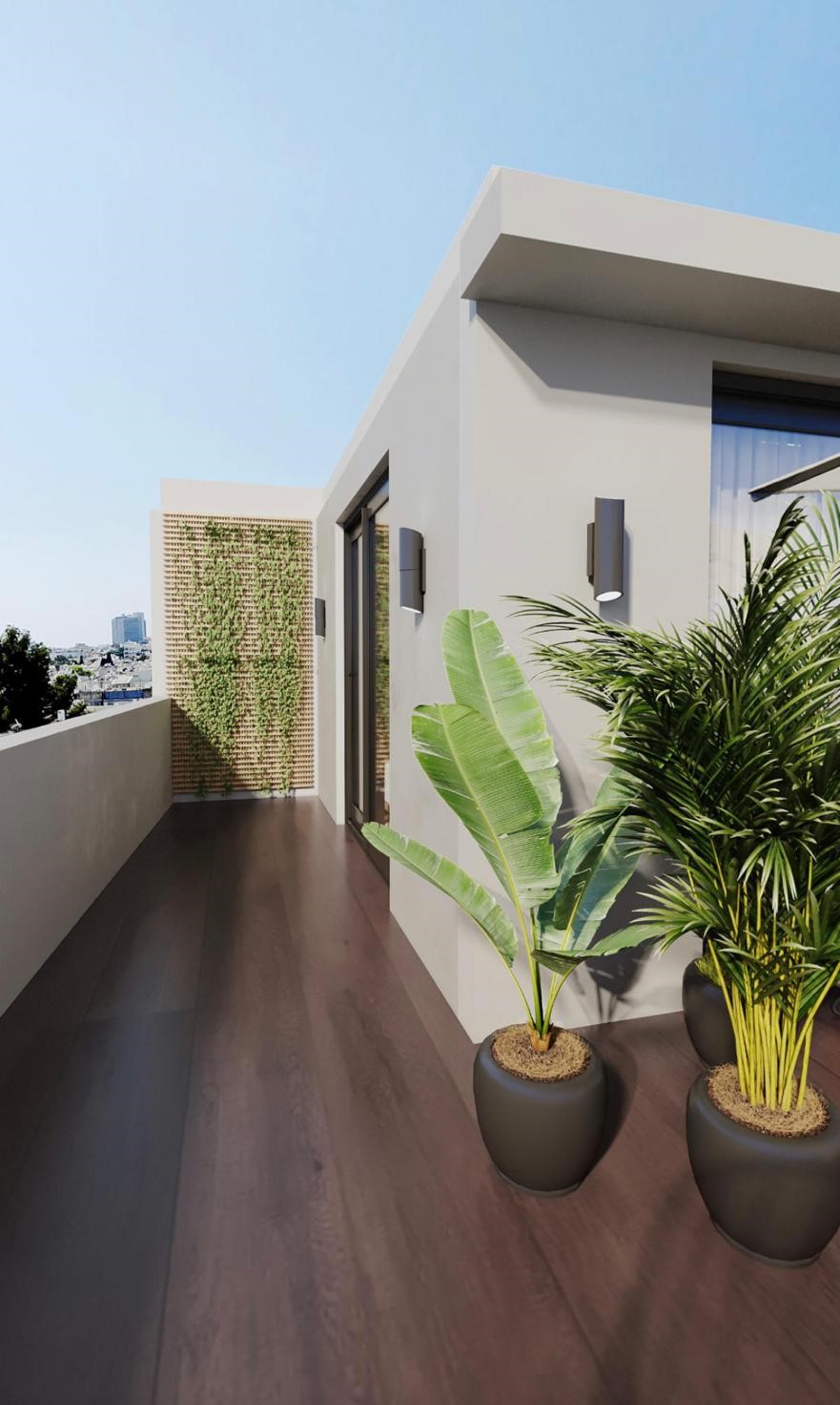 המרפסת המקיפה את הדירה עשירה בצמחיה ומעוטרת בבריכת זרמים מפנקת אליה עולים בדק עץ.