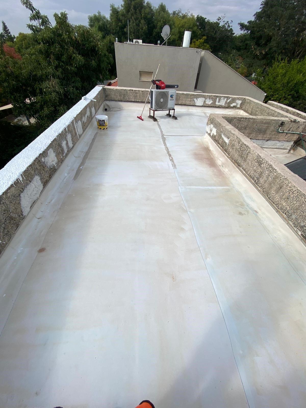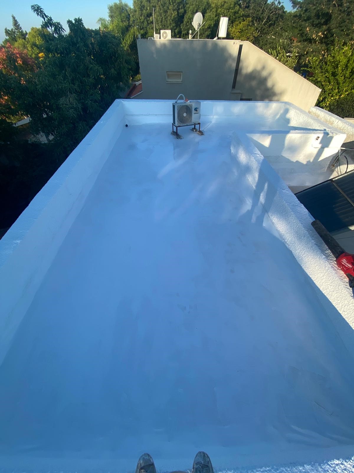 עבודת איטום גג בחומר אלסטומרי מהדור החדש, חומר מטורף סופר דופר אמיד ועם יתרונות של אמידות לשנים והתמודדות עם נזקי מזק אויר ומים עומדים והורדת טמפרטורה של הבניין וכן הלאה.