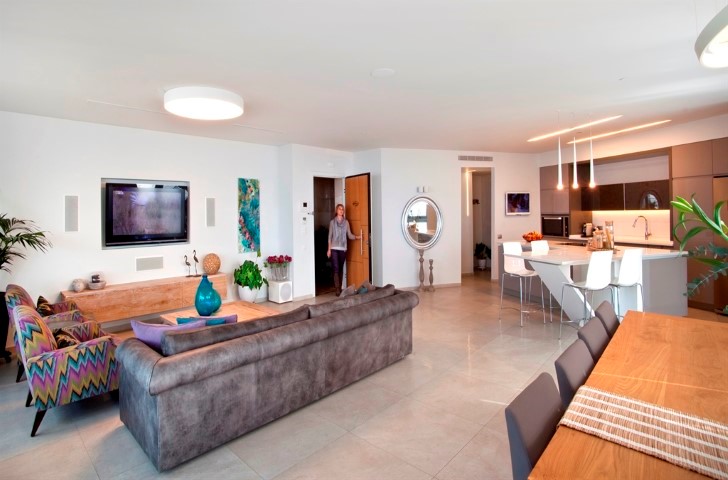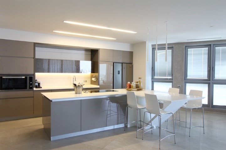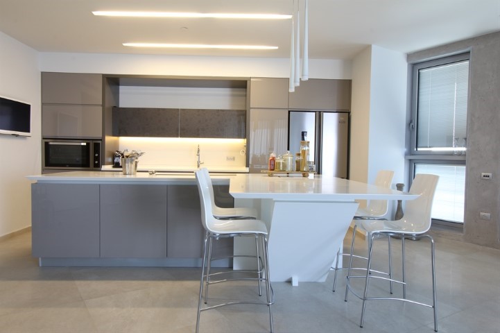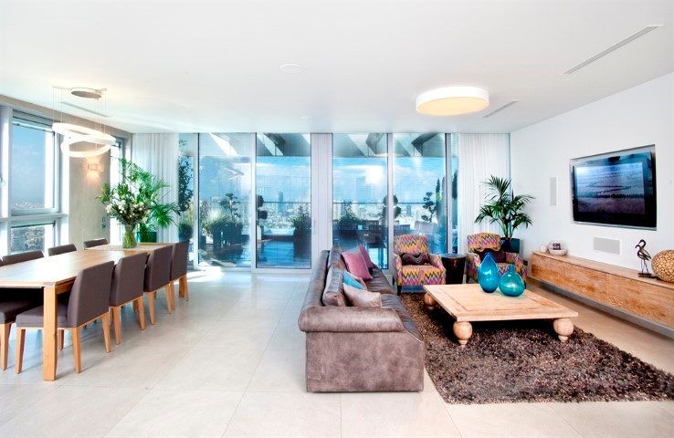 פנטהאוז בן 160 מ"ר הכולל מרפסת של כ 75 מ"ר תוכנן עבור בני זוג בשנות ה- 50 לחייהם באחת הקומות הגבוהות של מגדל מגורים יוקרתי בגבעתיים. הפנטהאוז תוכנן בקו עיצובי מודרני המשלב קווים נקיים לצד נגיעות חמימות ומזמינות . הפנטהאוז נרכש כמעטפת ודרש תכנון מוקפד. המטבח תוכנן כך שיהיה מרווח ופונקציונלי, אובזר לבישול ואפיה לאירוח בני משפחה וחברים וכלל אחסון רב ונגיש . באמצעות אי מפוסל הניצב במרכזו יצרנו תשומת לב מיוחדת למטבח. תוכננה יחידת הורים גדולה וחדר ארונות משולב עם הממד . המטבח, פינת האוכל והסלון תוכננו כחלל אחד גדול ומרווח, המשקיף מצידו האחד מערבה ומצידו השני דרומה אל הנוף הפתוח, באמצעות חלונות גבוהים מהרצפה עד התקרה. המסדרונות נוצלו לטובת שטחי אחסון גדולים ומוסתרים, המכילים בין היתר את כל מערכות החשמך והתקשורת המתקדמת שתוכננו.
