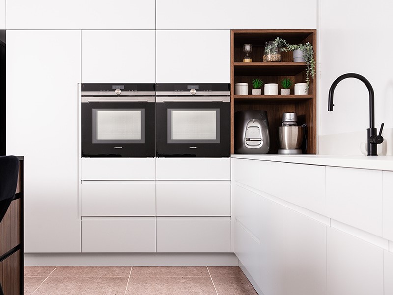 עיצוב מטבח בדירה ביבנה, מטבח מודרני ונקי משולב פורניר אגוז וצבע בתנור.