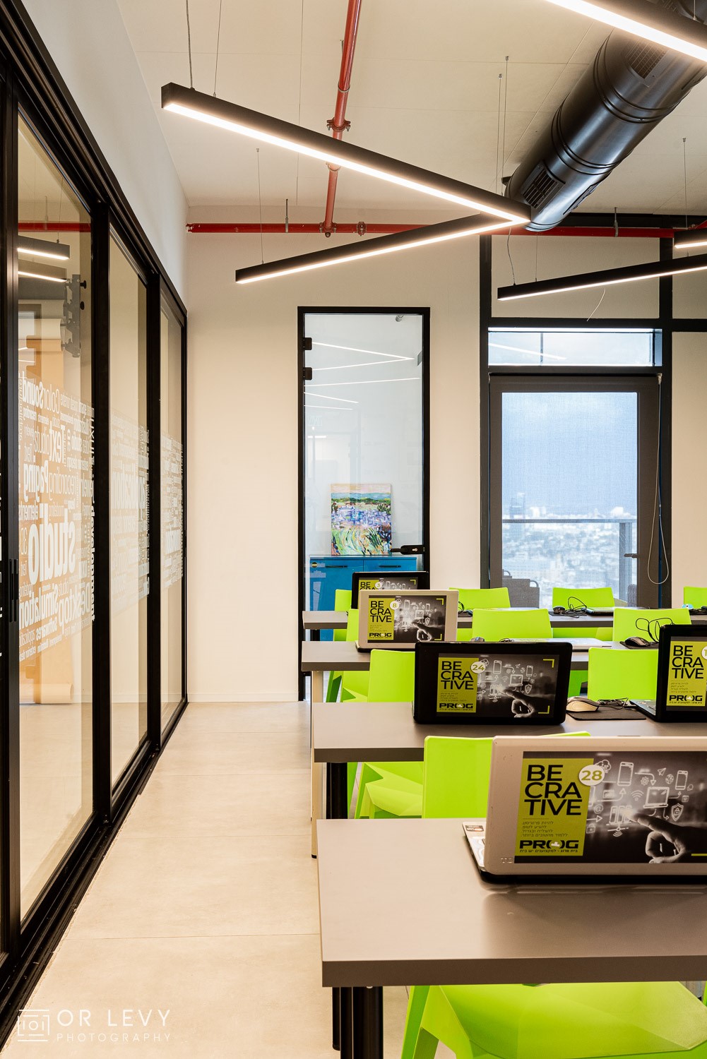 מכללת פרוג הי מכללה המובילה בתחומי היצירה, העיצוב, האמנות, התקשורת החזותית והמדיה עבור המגזר החרדי. במכללה רצו לייצר תחושה מאווררת במשרדים ובכיתות הלימוד שלהם, ניצול הנוף אליו המגדל משקיף, ויצירת תחושה מודרנית. השימוש במחיצות הזכוכית היה הפתרון הנכון ביותר עבורם.