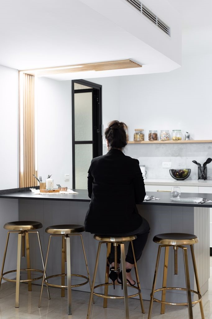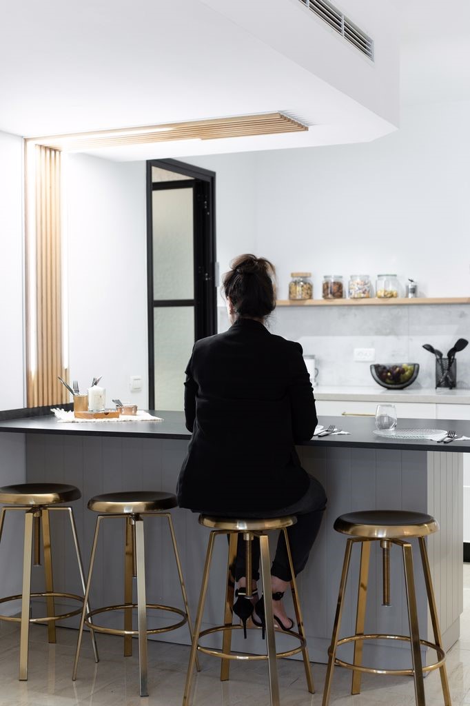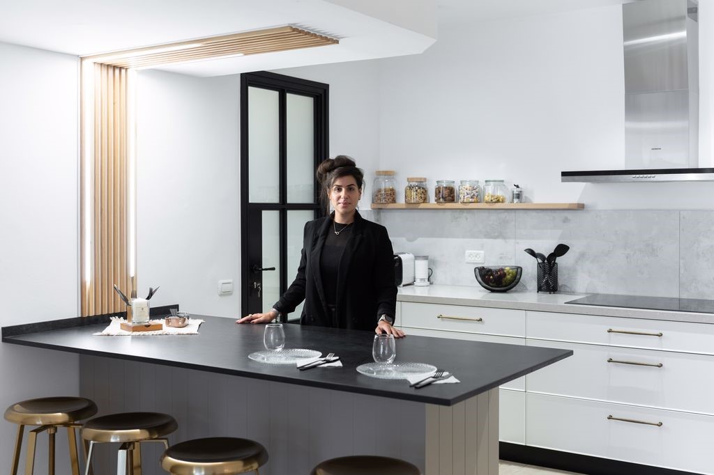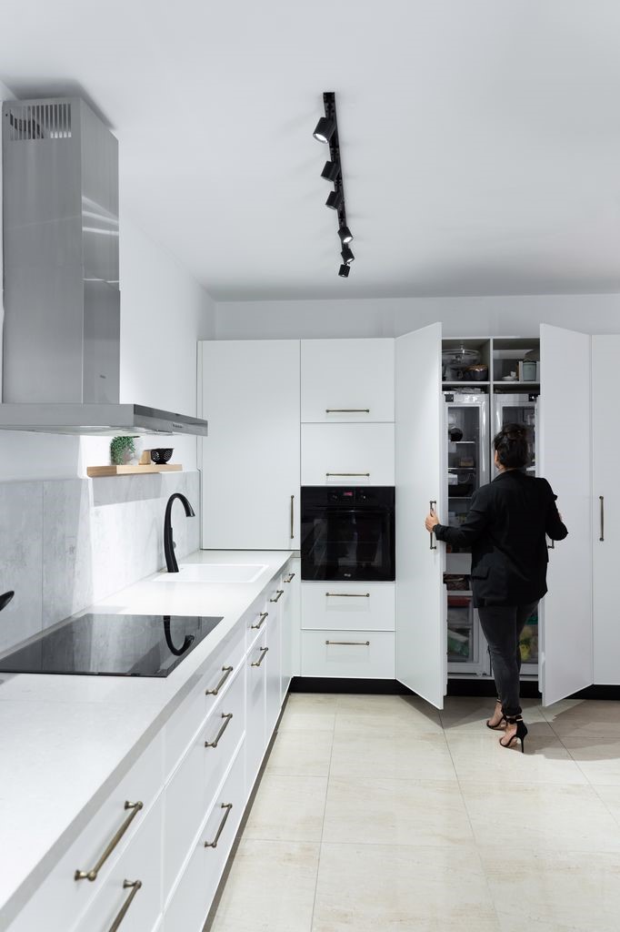 בחרנו במקרר אינטגרלי מוסתר בארונות המטבח כדי ליצור הרמוניה ואחידות עם ארונות המטבח.. את באי החלטנו לבחור גוון וחומר בשונה מארונות המטבח כמו גם המשטח שיש, על מנת ליצור הבדל בין האי לבין יתר ארונות המטבח.