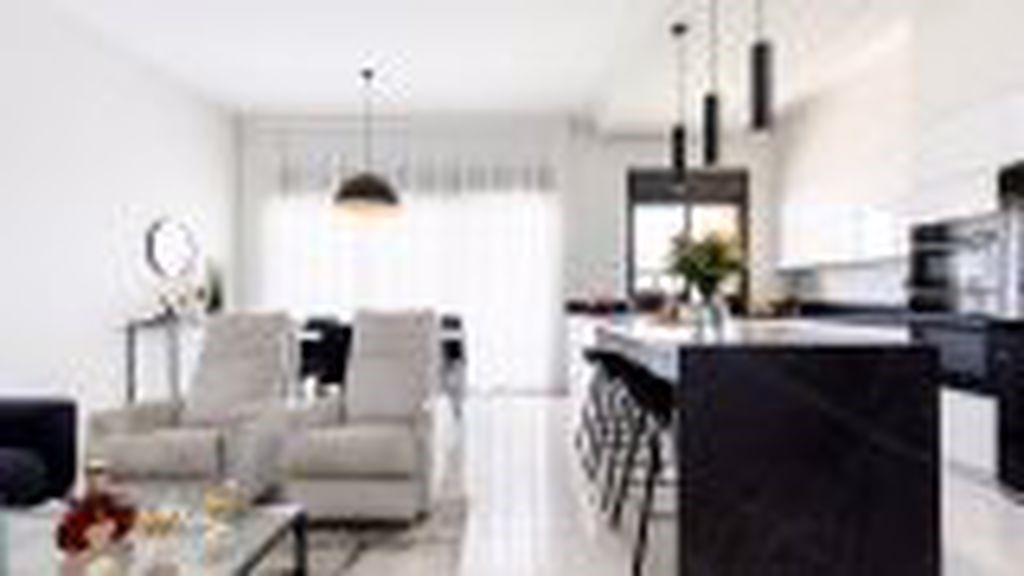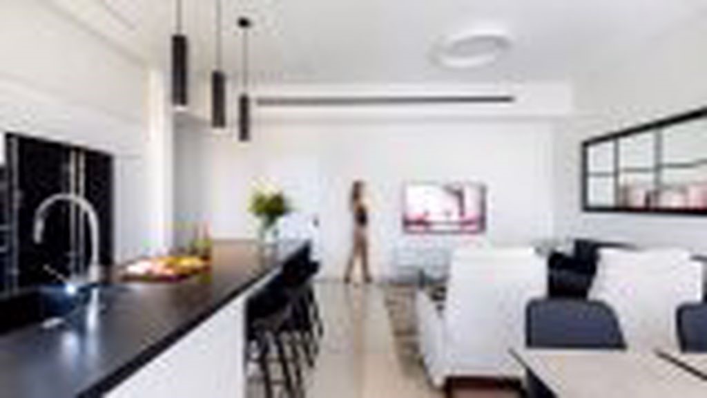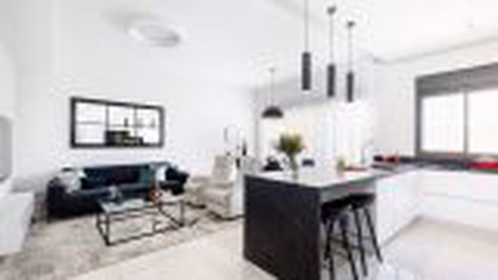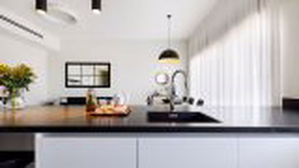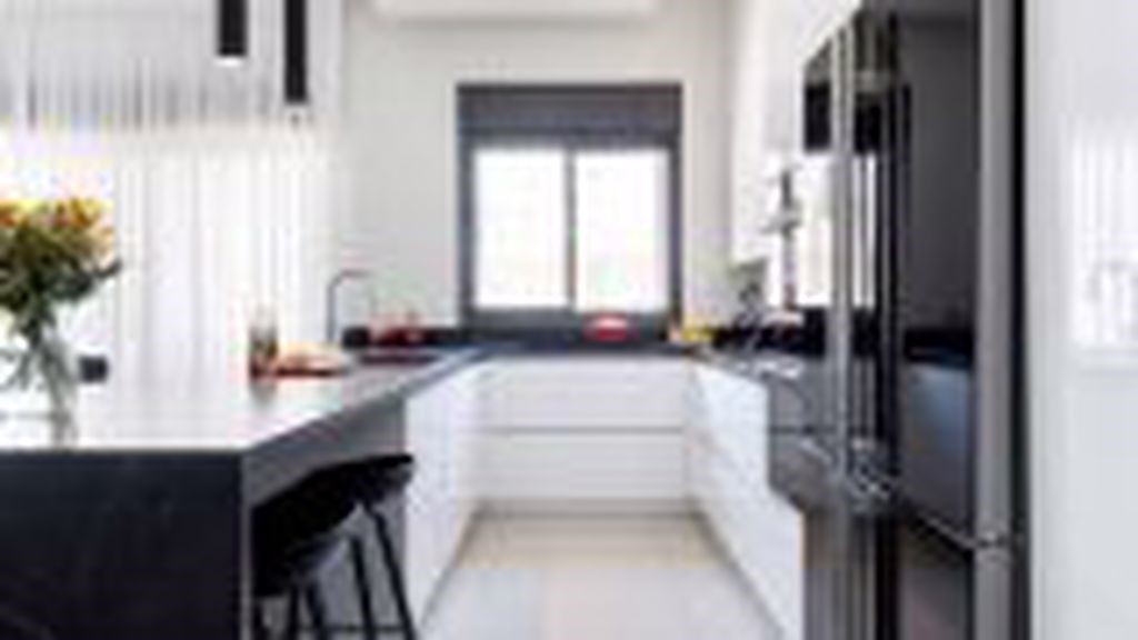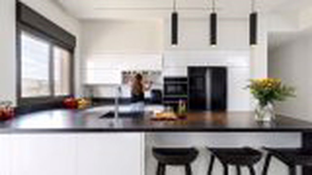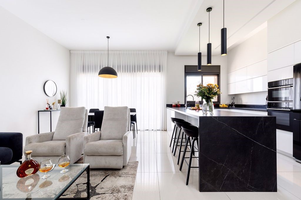את החלל הציבורי עיצבנו בגוונים בהירים והכנסנו דרמה בעזרת מוטיבים בגוון שחור כמו בגופי התאורה ובמוצרי החשמל, משטח השיש וכדומה.