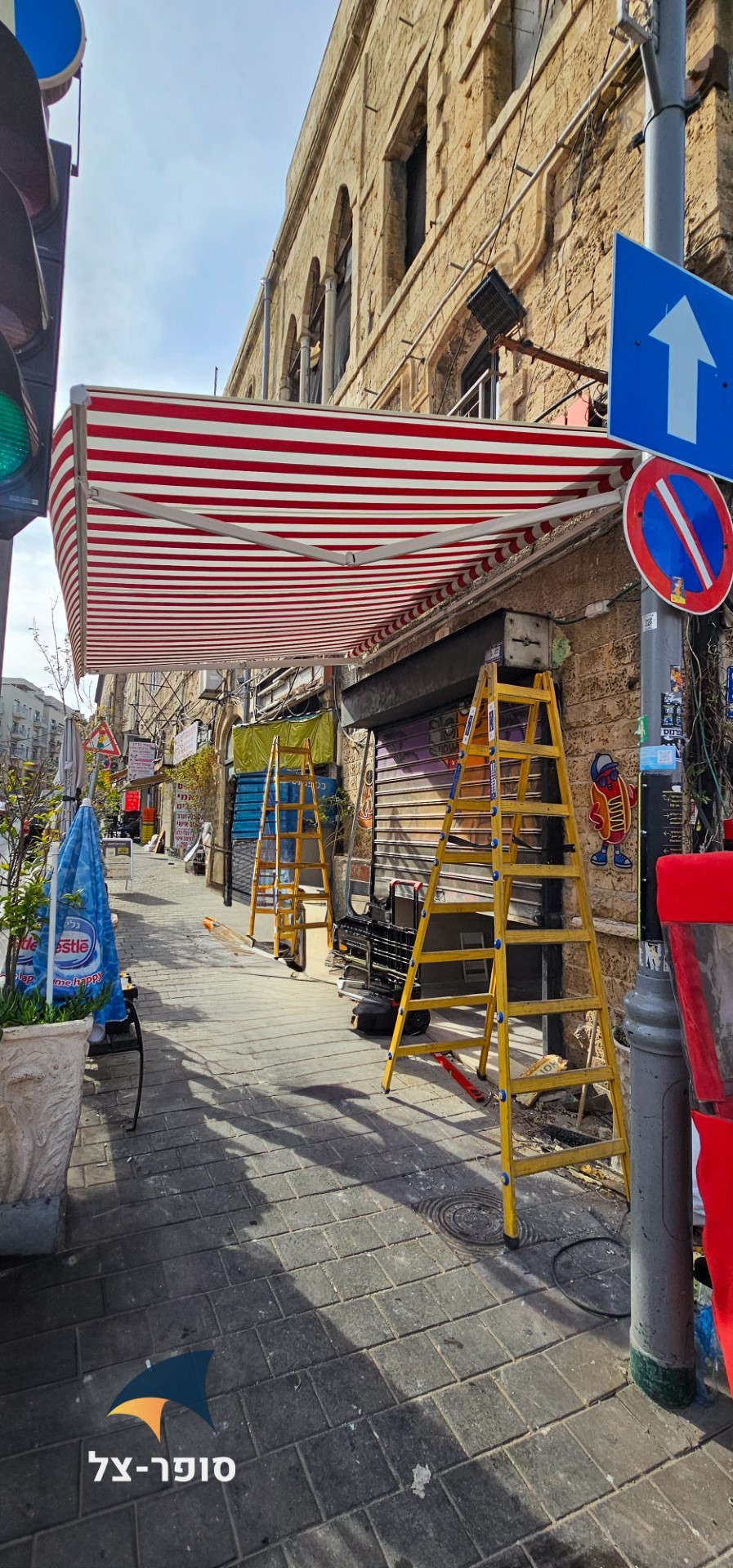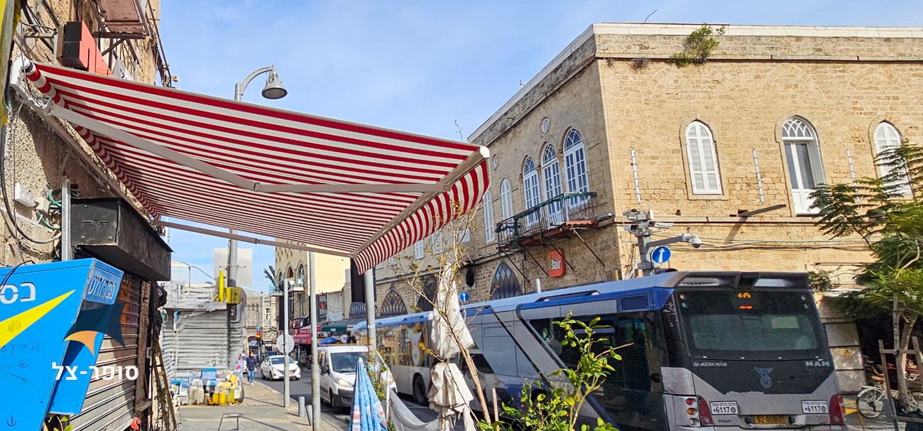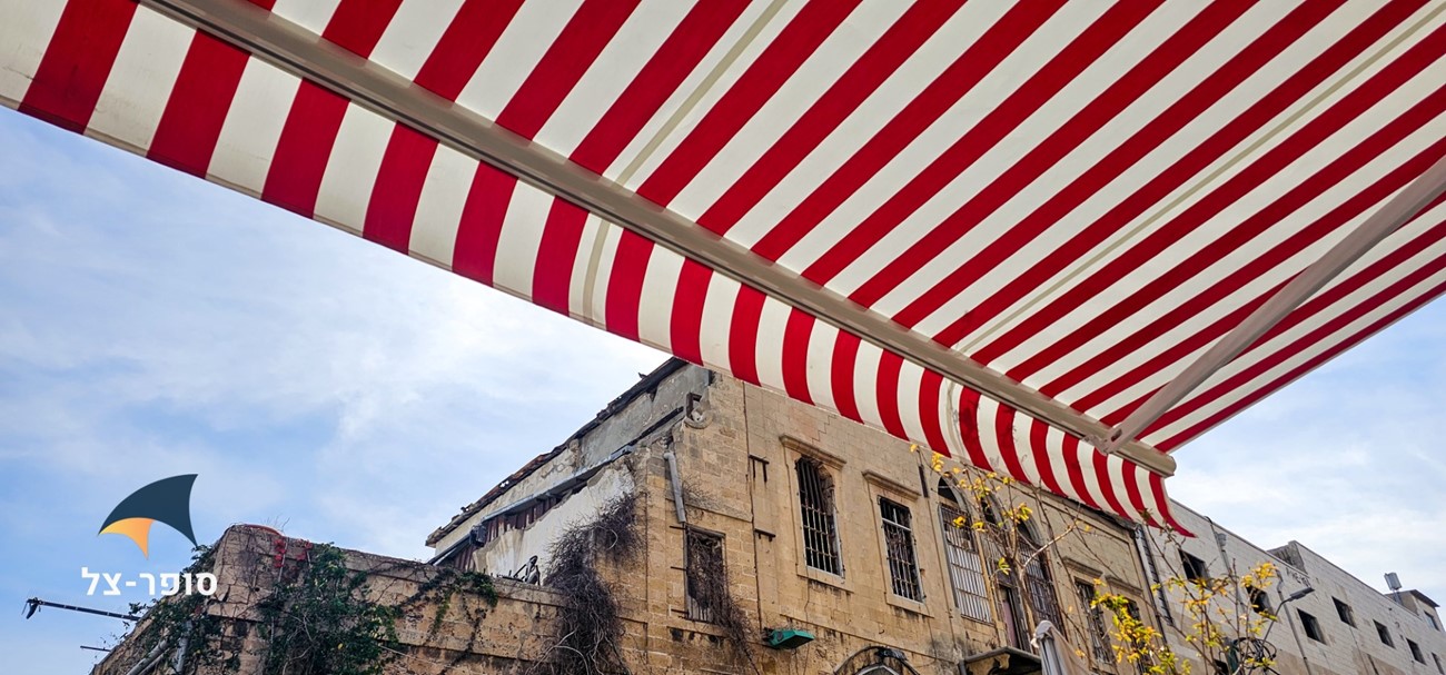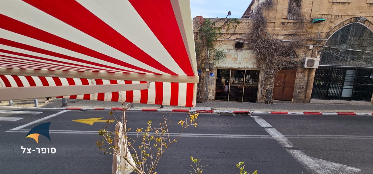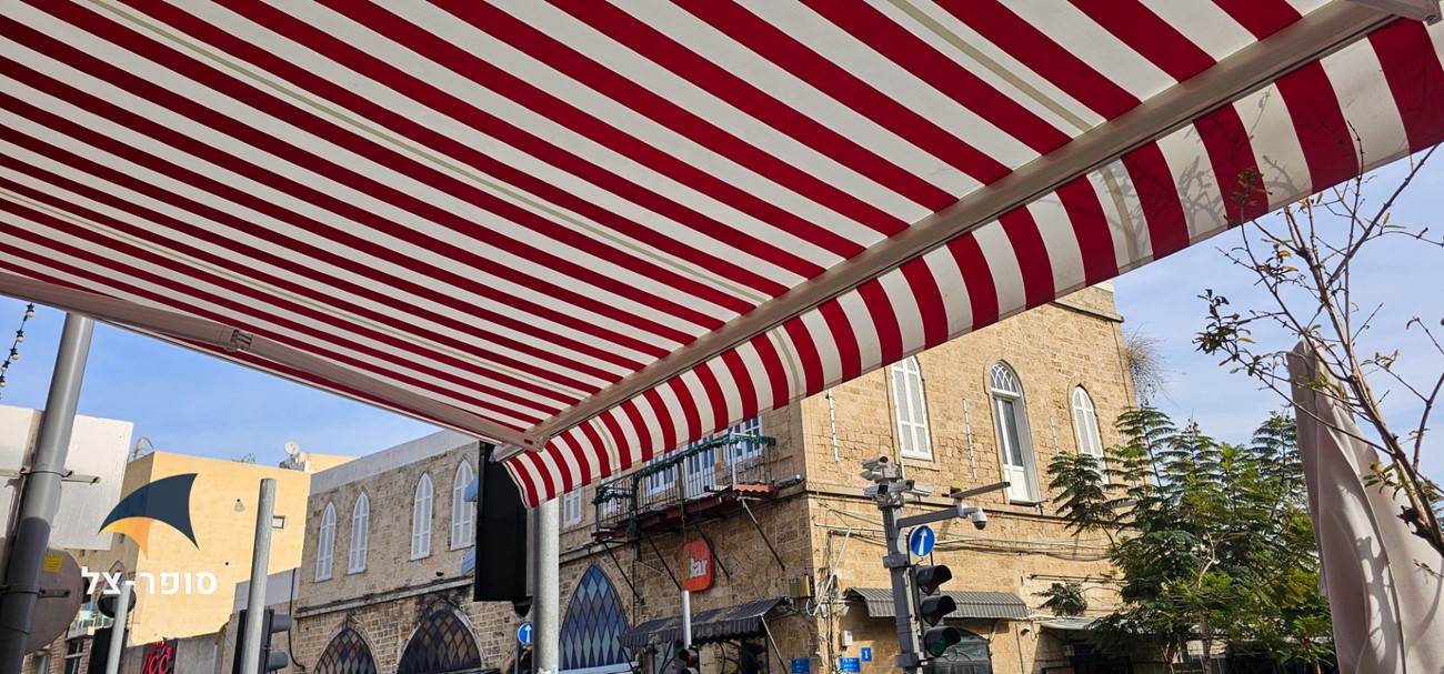 הלקוח פנה אלינו בבקשה להתאים סוכך זרועות חשמלי מעוצב לעסק בלב יפו.