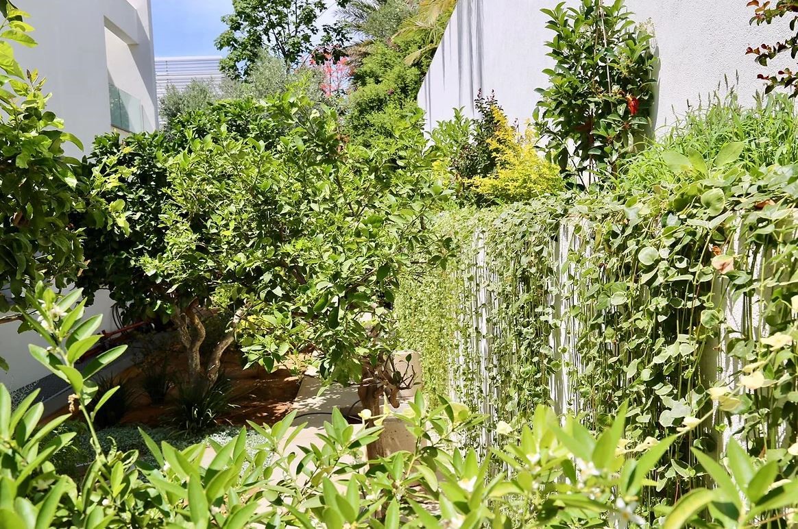 בסמוך לבריכה ננטעה פלומריה ריחנית גדולה ותחתיה דשא זואיסיה.שיחי מורן מבריק נשתלו לאורך הגדר וצמחיה עשבונית תחמה את הערוגה.