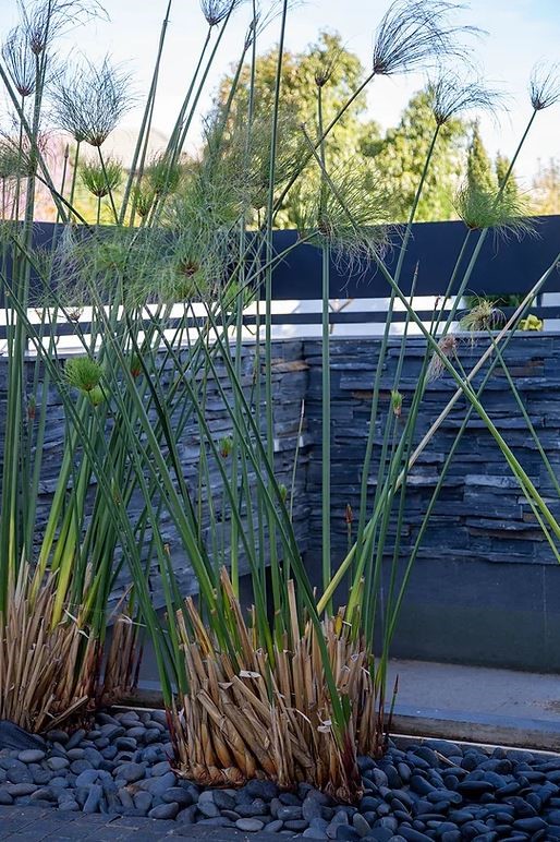 אבני מדרך מבזלת הונחו אל עבר גינת פיפלים קטנה