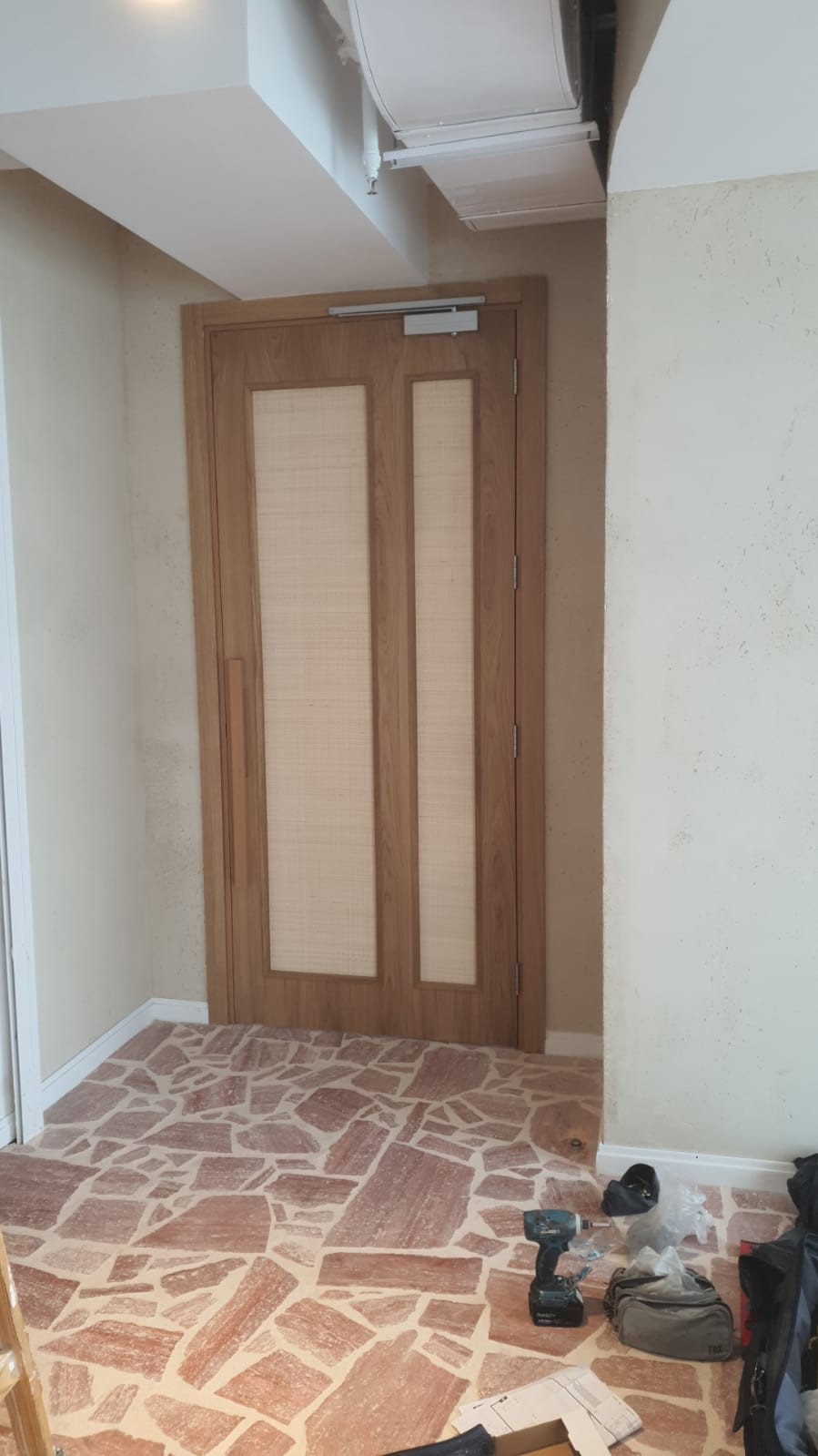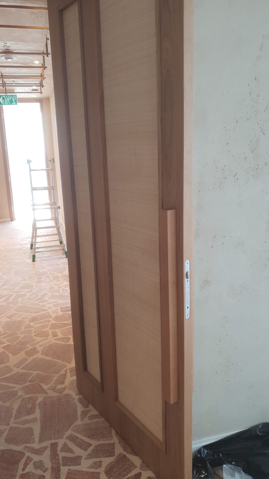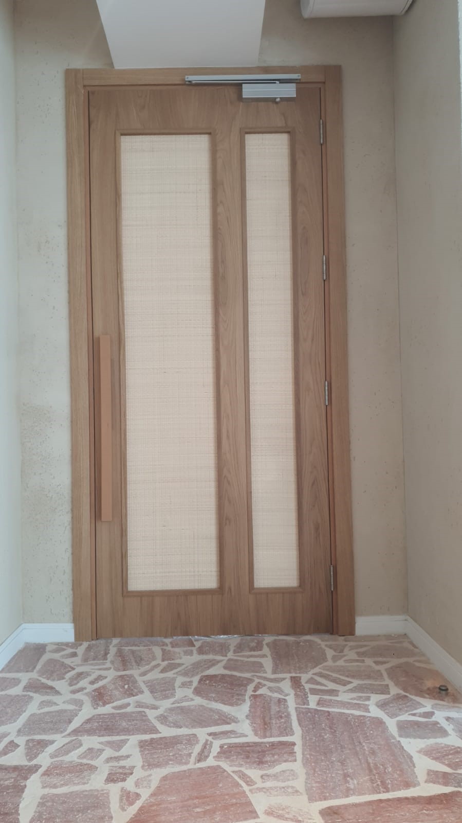 דלת כניסה לספא משקוף עץ גושני כנף פורניר עם שני חלונות מצופים בראטן רשת חבלים,