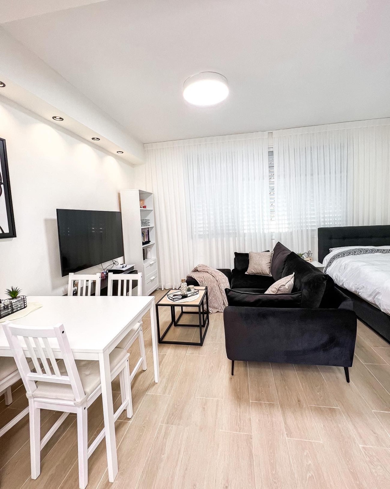 החלל מיועד לזוג צעיר שביקשו פונקציות רבות בדירת חדר וחצי (30 מ״ר).