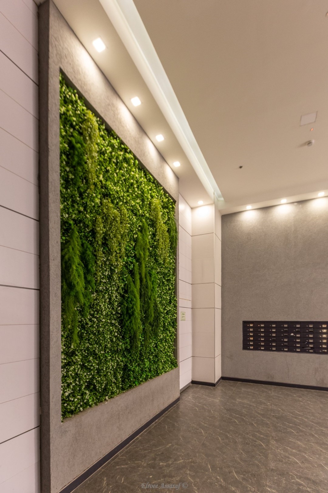 הוספתי לו צמחיה "נשפכת", כדי לתת מראה טבעי ו"זורם" לקיר ולחזק את התלת-מימדיות שלו. כך המראה האורבני האפור של הלובי מתרכך ונעשה "מזמין" יותר.