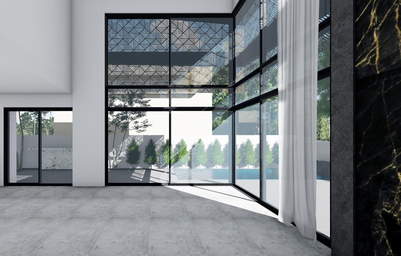 דלת כניסה מעוצבת גבוהה במיוחד, אזור מגורים עם חלל כפול בגובה של 7 מטר ומערכת הצללה בעיצוב ייחודי ע"י משרביה מעוצבת עשויה אלומיניום ב CTC .